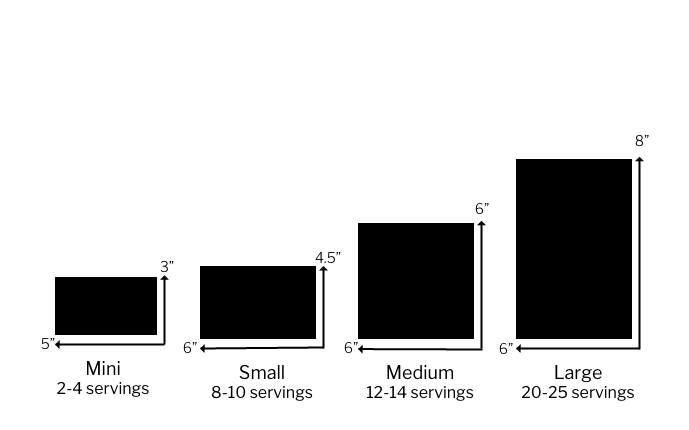 We have seven different cake sizes to choose from, each with their own serving size, dimensions, and recommended cake stand. Here's a breakdown of what you can expect for each one: