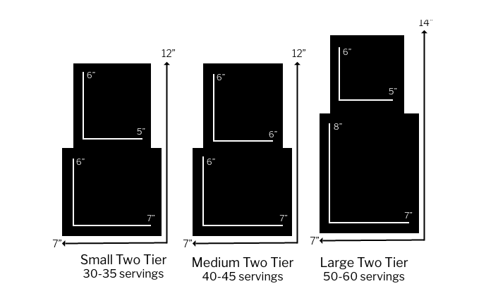 Next to all cake sizes on the website, we show how many servings there are. Our smallest size is the Tiny, which serves 5-6, and our largest is the Double Large, which serves up to 60 (see the Sizes section above for more details). For receptions that require more than 60 servings, we also provide Sweet Table Packages, which can be a great complement to your Wedding Cake. We offer different options to suit various budgets, so there's something for everyone.