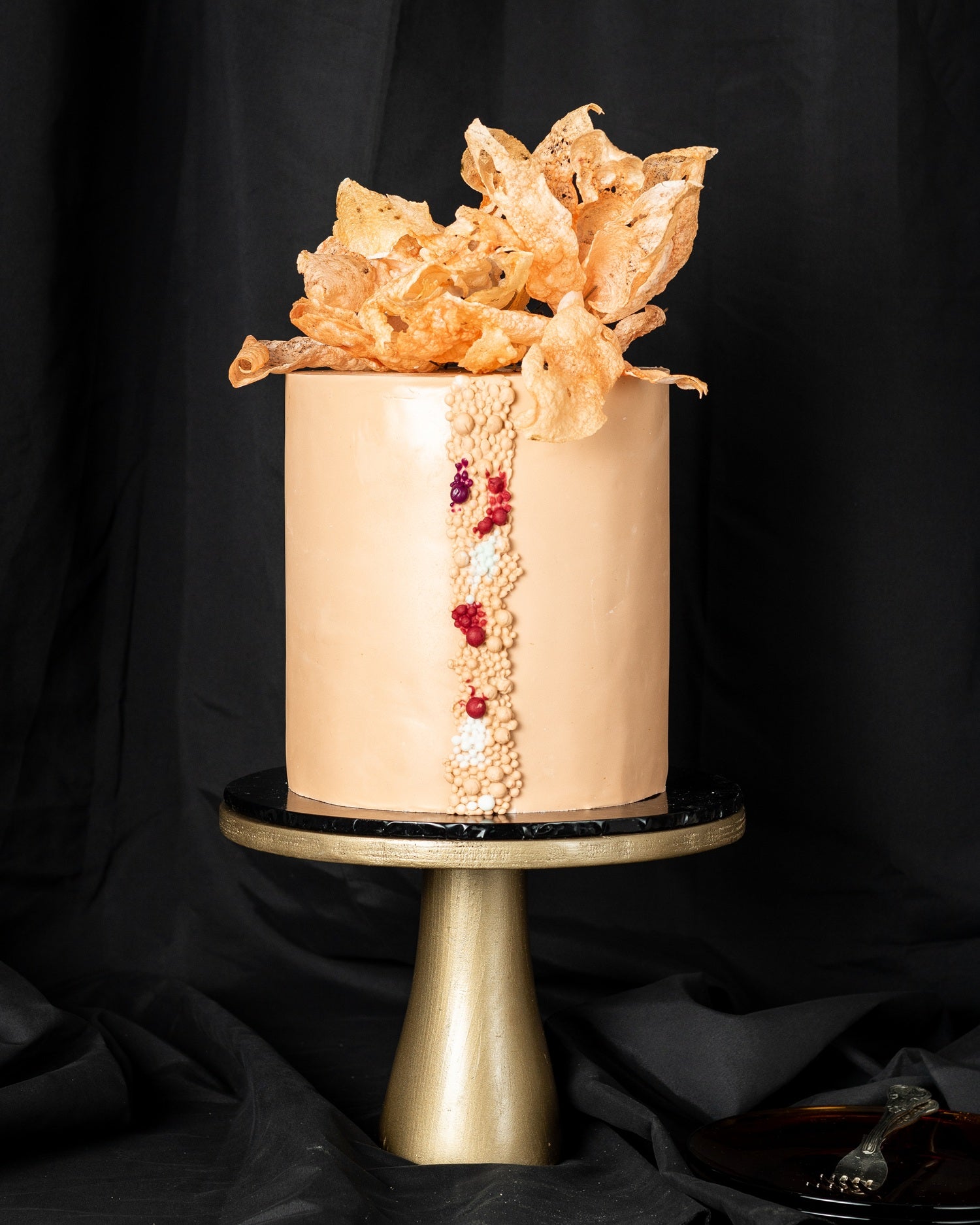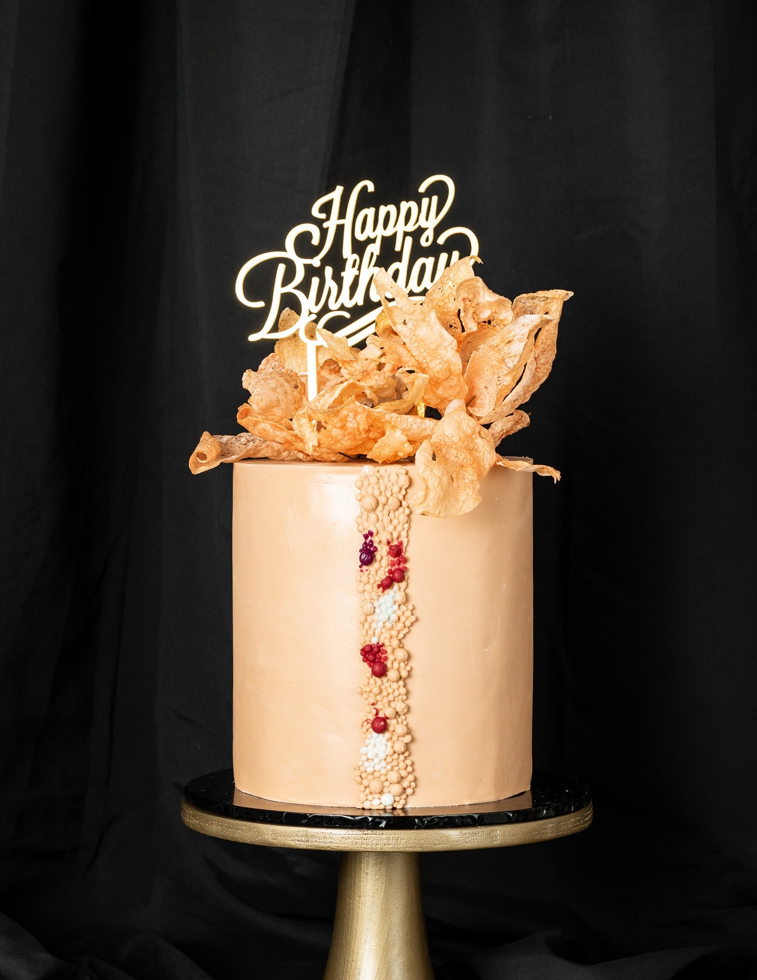 Amber Crunch Cake dares to be different. Wrapped in smooth caramel-toned buttercream, it's crowned with dramatic crispy shards and a vertical cascade of textured candy pearls and edible gems. This bold, modern design is perfect for birthdays, art-forward events, or dessert bars. Personalize with colors, initials, or a custom topper.