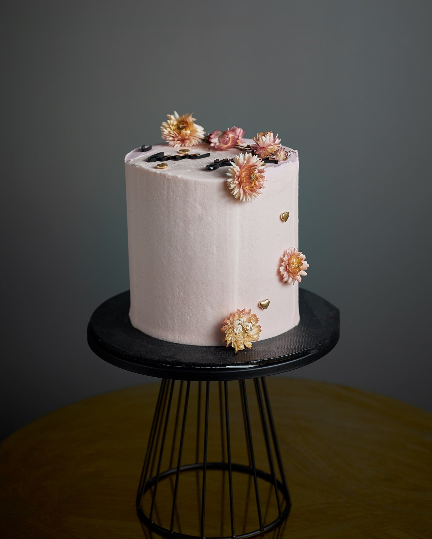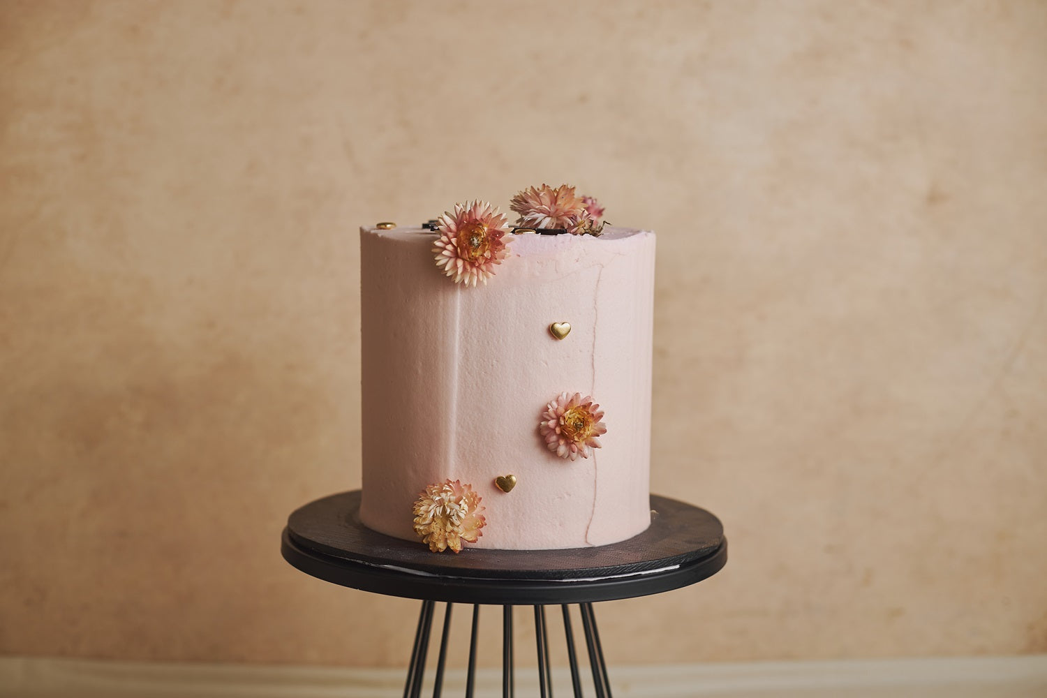 Blush Bloom is a dreamy pastel-pink cake adorned with dried flowers and dainty gold hearts. Its tall, sleek silhouette and floral charm make it a graceful centerpiece for birthdays, bridal showers, or “just because” moments. Light, romantic, and customizable with toppers or messages—it’s perfect for adding softness and style to your celebration.
