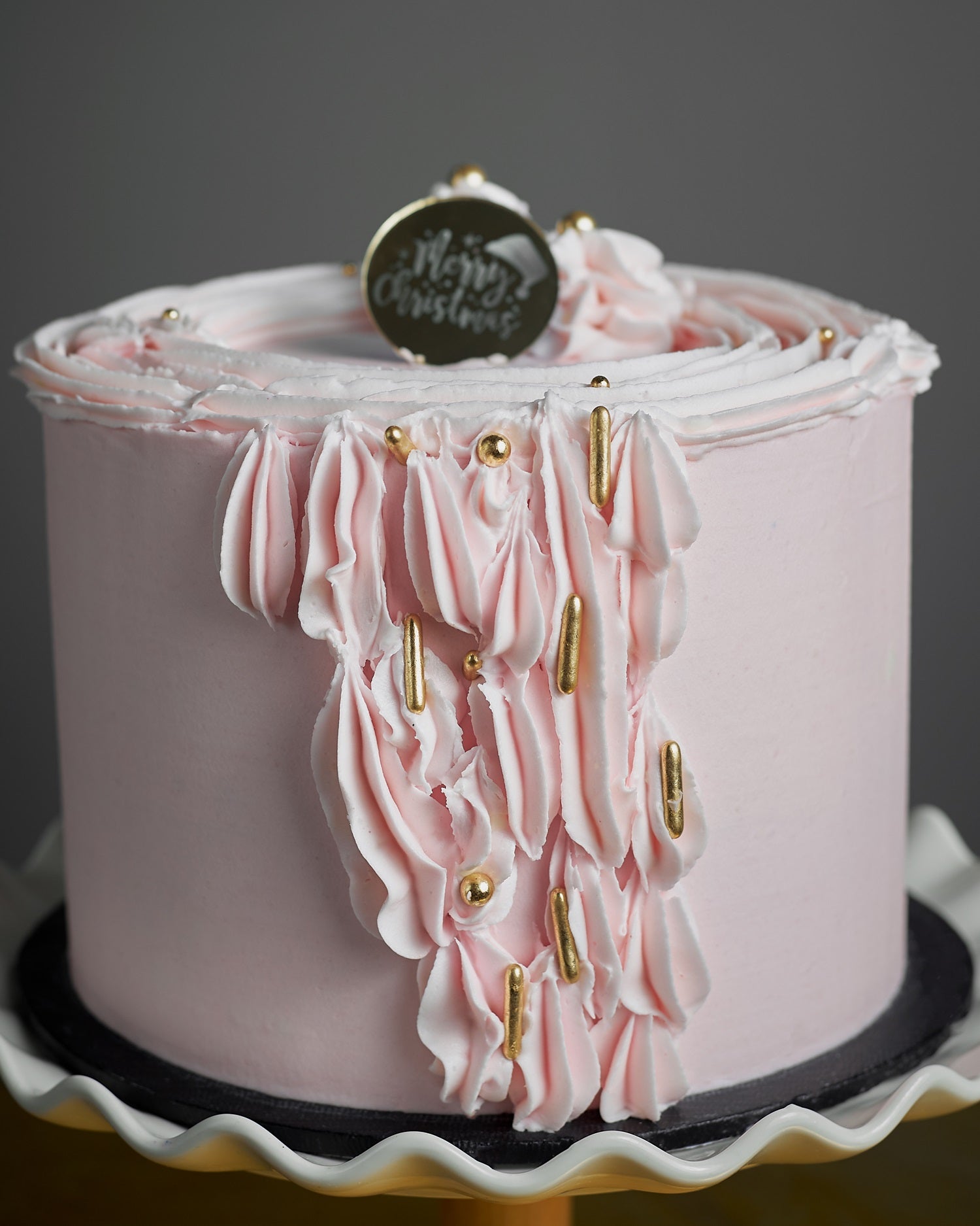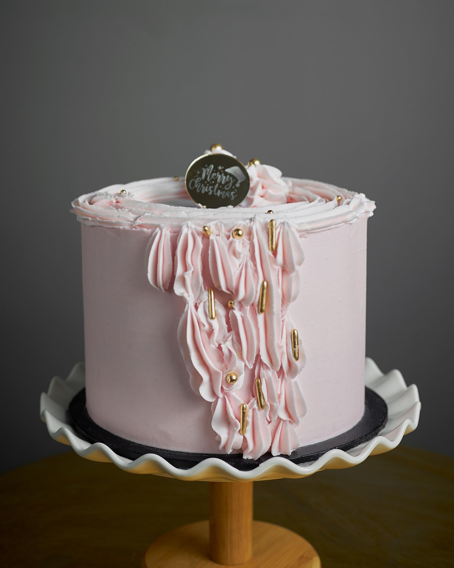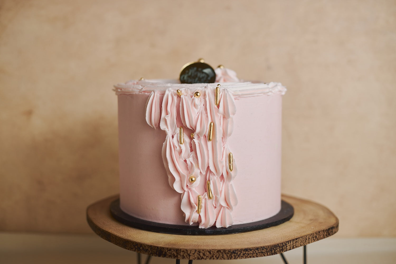 Blush Cascade features a smooth pastel-pink finish with dreamy piped ruffles gently cascading down the side, accented with chic gold pearls. Feminine, fresh, and photo-ready, it’s a go-to for birthdays, bridal showers, or any heartfelt celebration. Customize the topper, color, or message to match your moment.