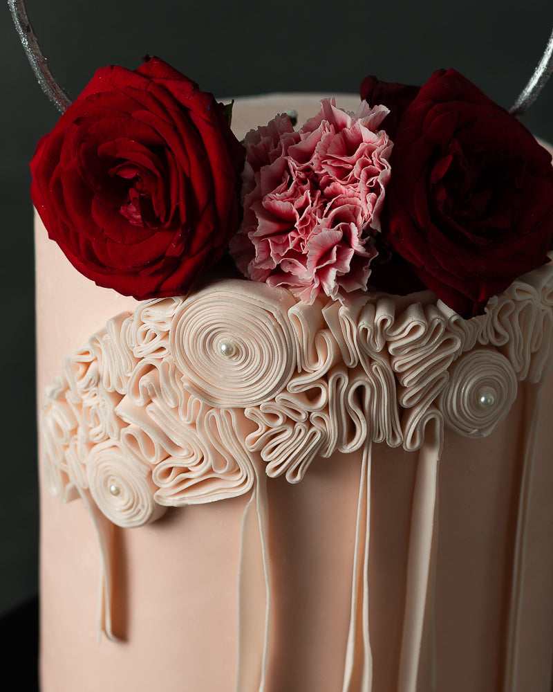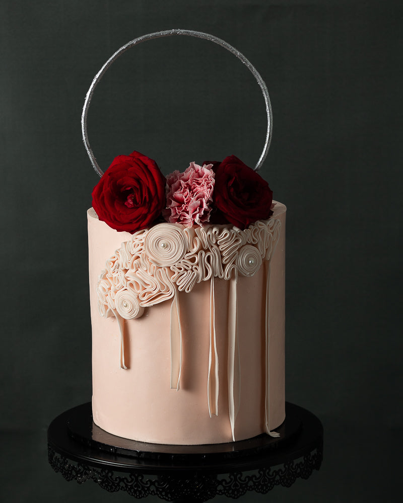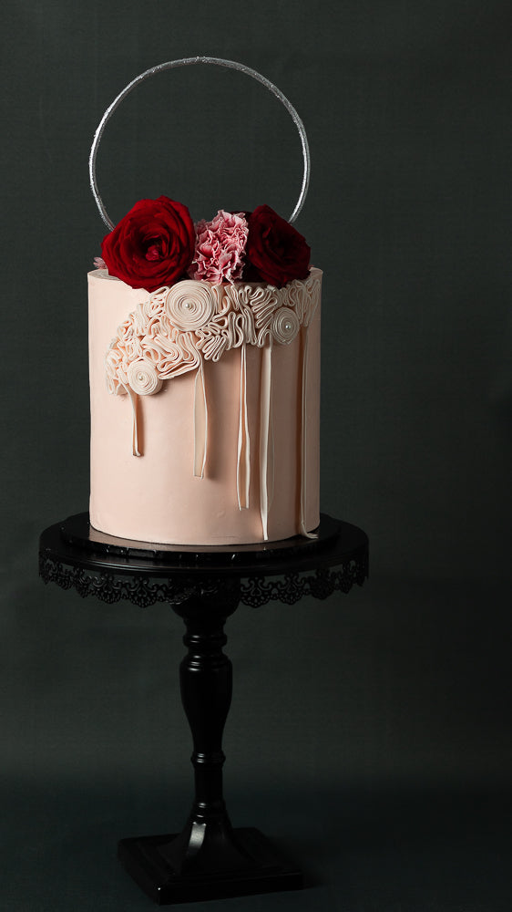 Blush Halo is soft romance with an edge. Pale blush fondant meets cascading hand-rolled ruffles, soft fondant drips, and lush fresh florals in deep crimson and pink. Topped with a minimalist silver halo, it’s both whimsical and refined. Ideal for weddings, showers, or intimate celebrations. Customize with color, florals, or a topper.