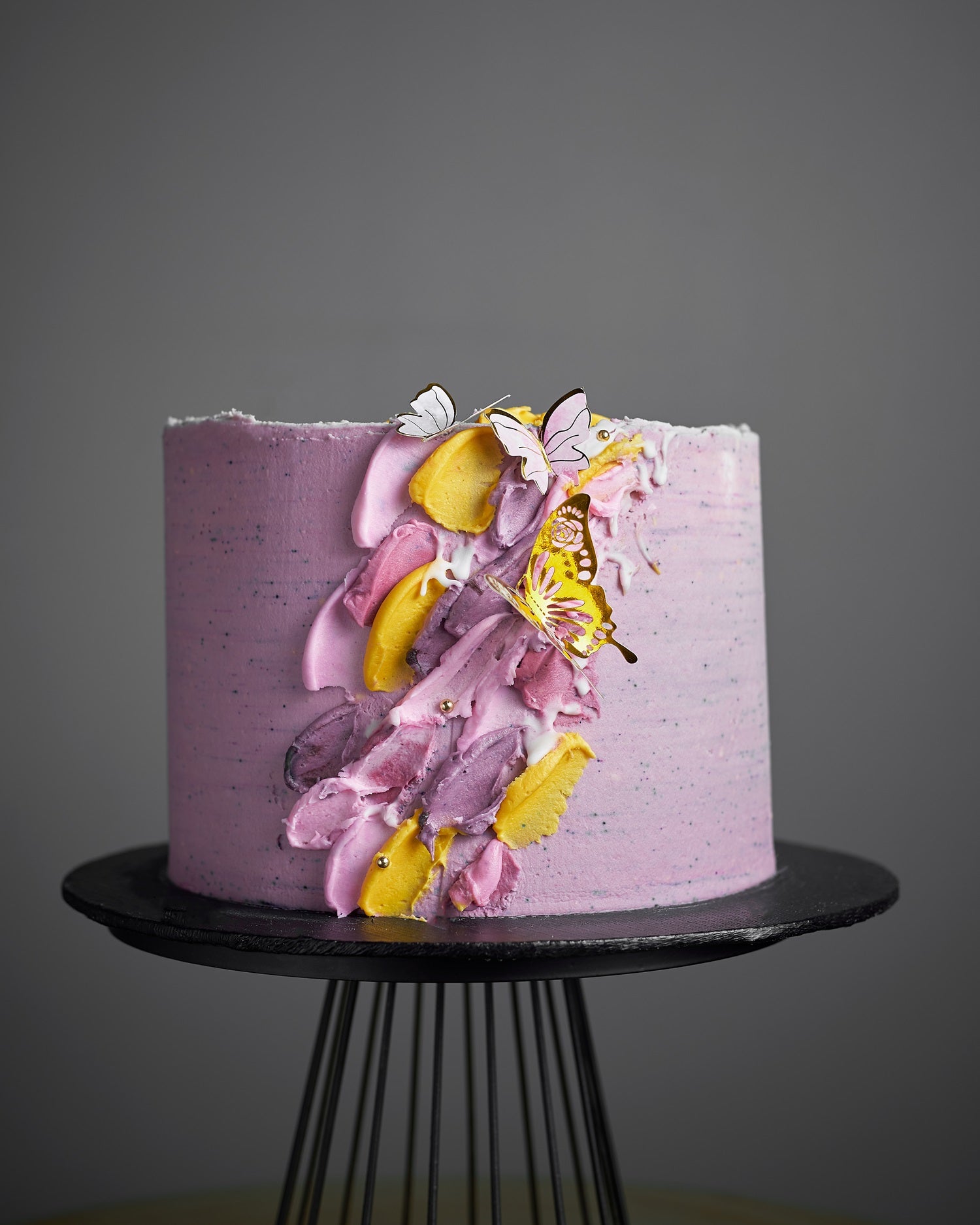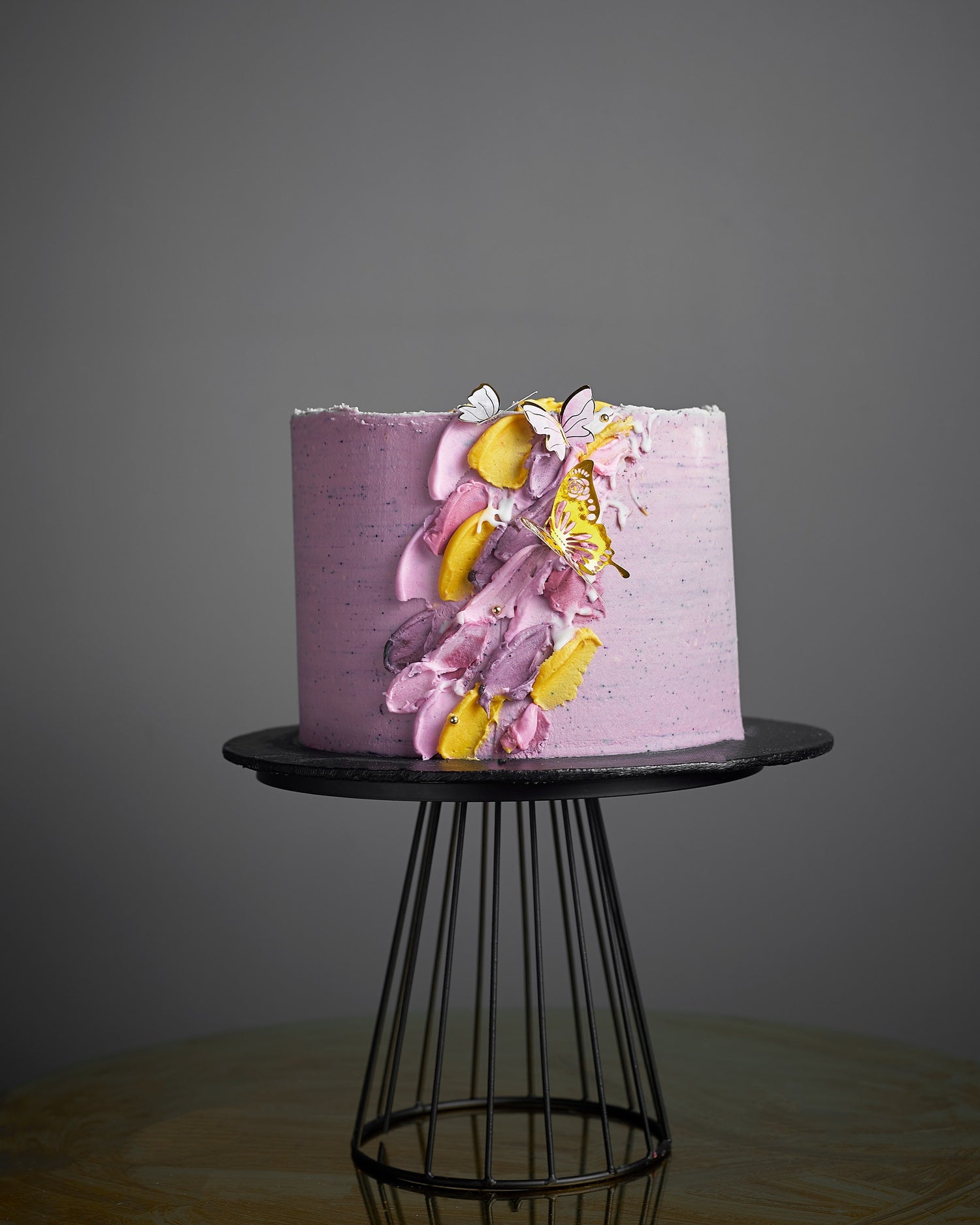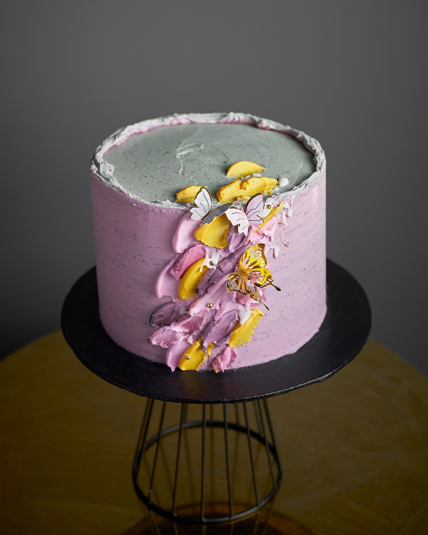 Butterfly Bloom features lavender-pink and slate-grey frosting, with sculpted buttercream swirls, yellow fruit slices, and delicate edible butterflies fluttering across its surface. A modern, artistic cake that feels like a celebration in full bloom. Perfect for birthdays, baby showers, and heartfelt milestones. Customize colors, add toppers, or a message to make it yours.