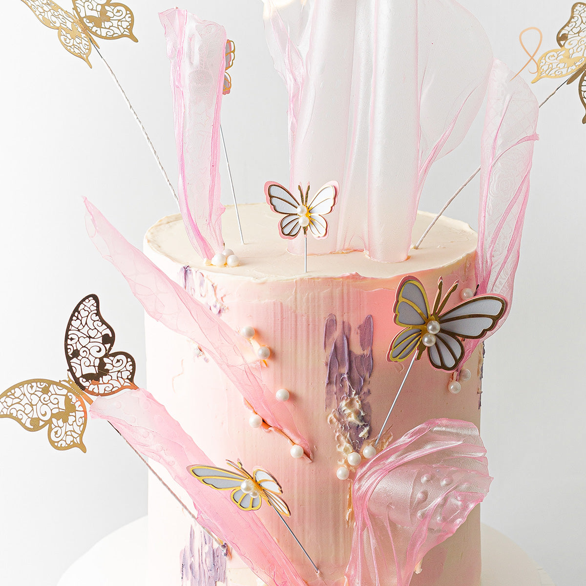 Cake Wondertale feels like a page from a fantasy. Delicate pink sails rise from a blush canvas, surrounded by shimmering butterflies and scattered edible pearls. It’s light, magical, and full of whimsy perfect for birthdays, baby showers, or enchanted events.