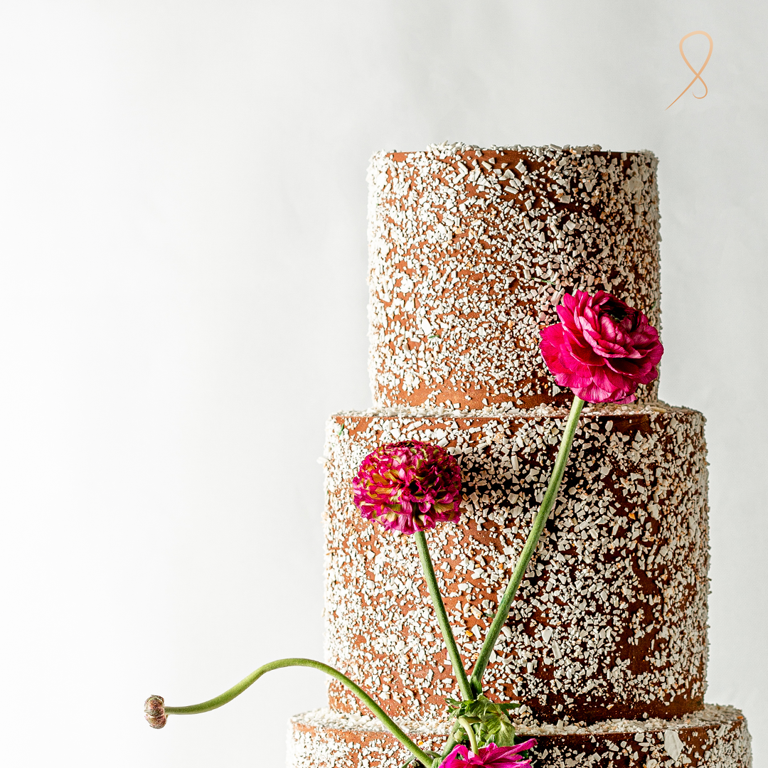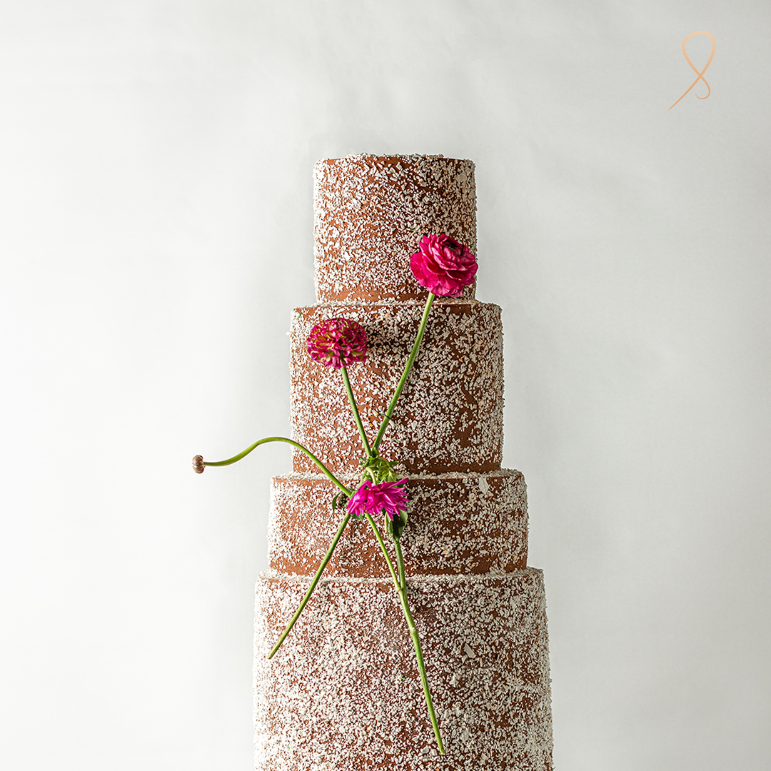 Cocoa Petal stands tall in rich chocolate fondant, textured with hand-dusted vanilla flake accents for a modern, organic finish. Deep fuchsia florals climb asymmetrically across the four tiers, adding drama and color. It’s the perfect fusion of rustic and refined—ideal for fall weddings, fashion-forward birthdays, or luxe dessert tables. Personalize with metallic touches or bold blooms.