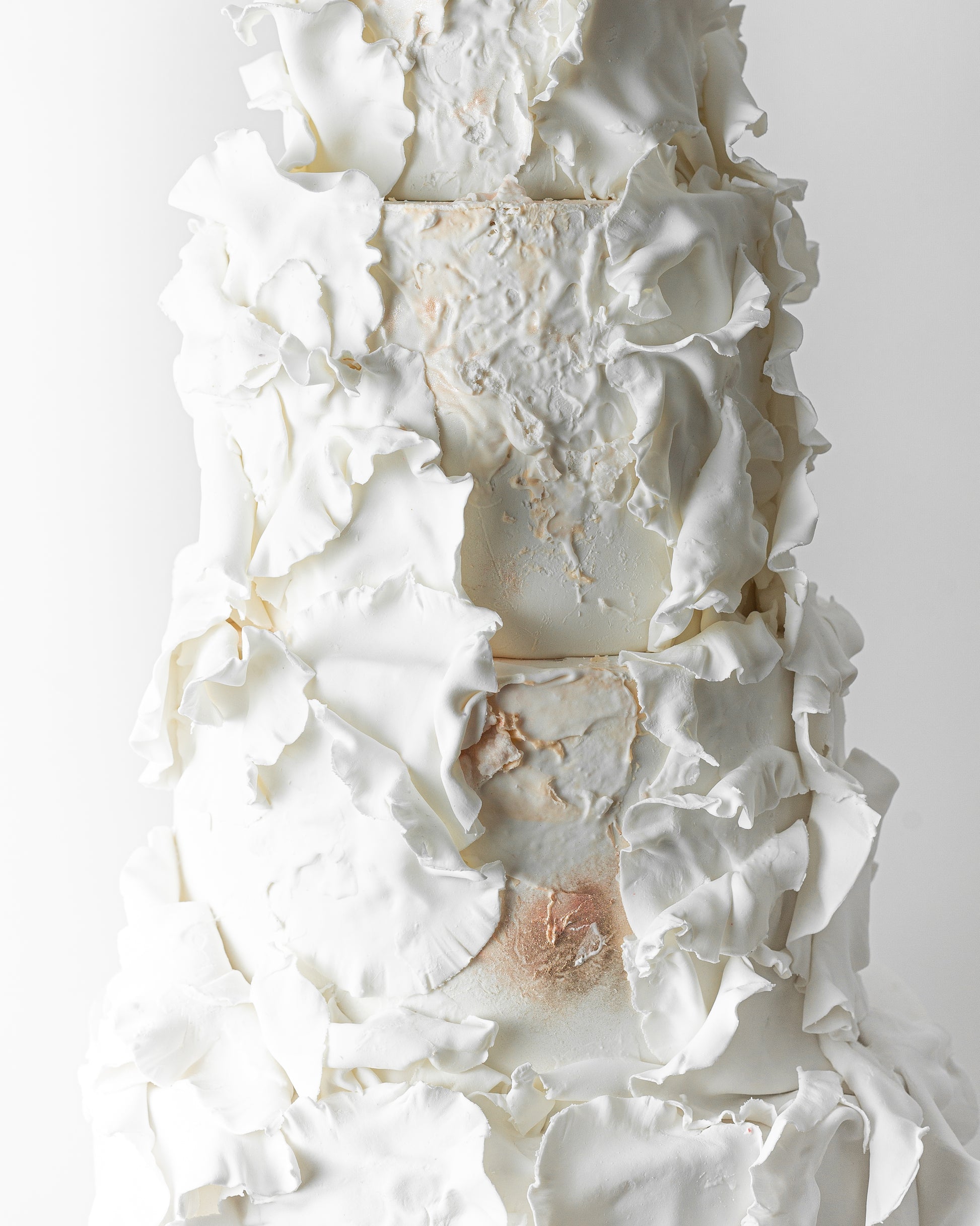 Celestine flows like a cloudscape. Tall, tiered layers are enveloped in hand-sculpted fondant ruffles, kissed with soft gold and blush undertones. It's a romantic, sculptural statement for luxury weddings and once-in-a-lifetime celebrations.