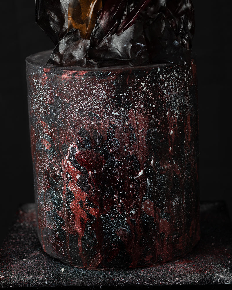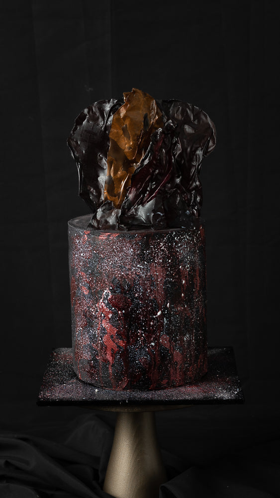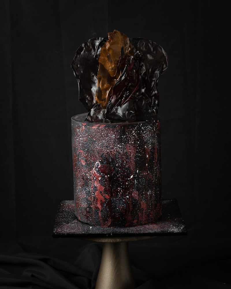 Crimson Ember captivates with a dark marbled buttercream, flecked with crimson and metallic specks, evoking fire and molten rock. Topped with an abstract chocolate sculpture, it brings an avant-garde edge. Designed for milestone birthdays, evening soirées, and bold statement events.