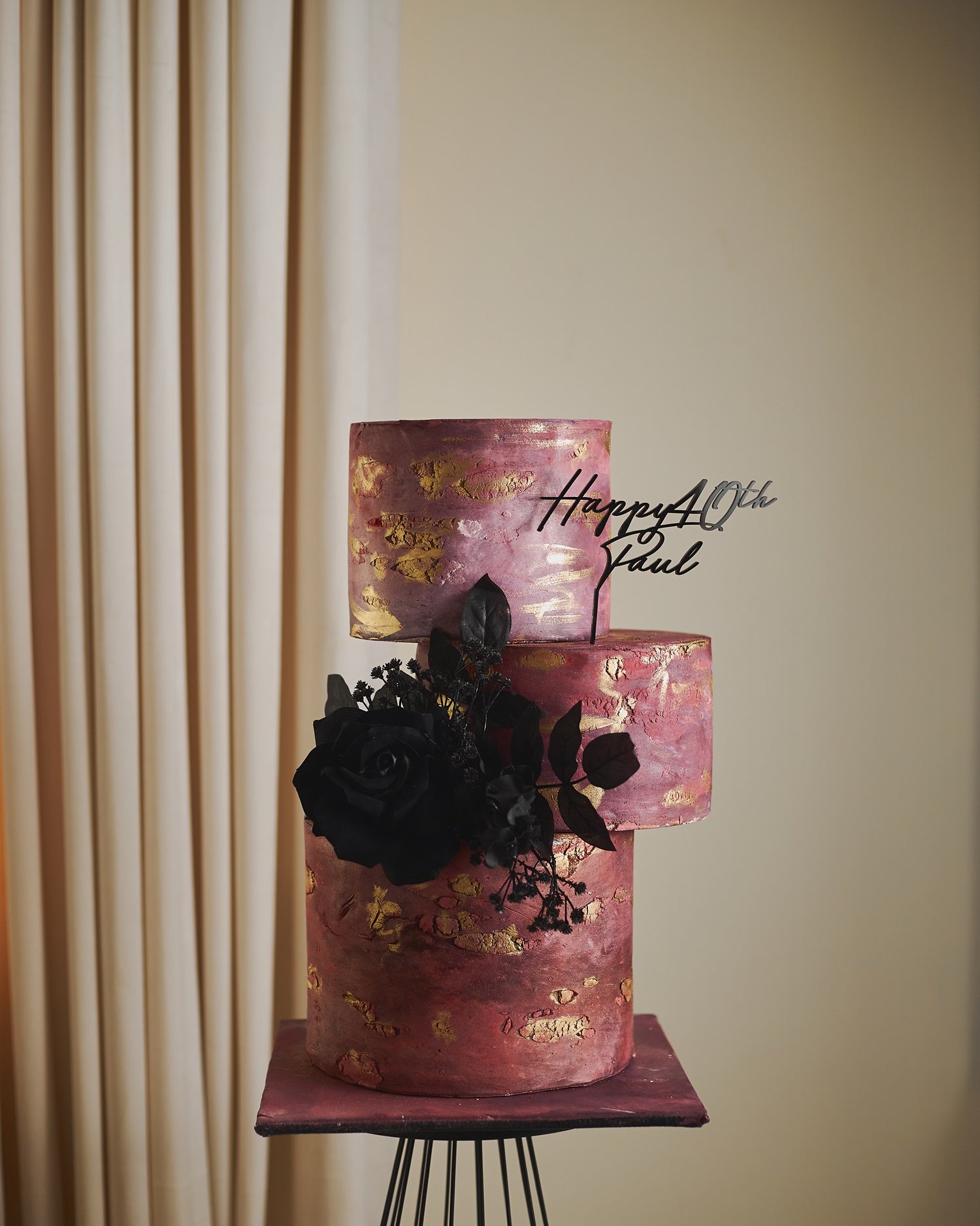 Crimson Noir is a statement piece with deep crimson buttercream, brushed gold leaf, and moody black florals. Its modern offset tiers and rich textures make it ideal for 40th birthdays, glamorous soirées, or edgy weddings. Customize with a name topper, floral colors, or message to match your vibe.