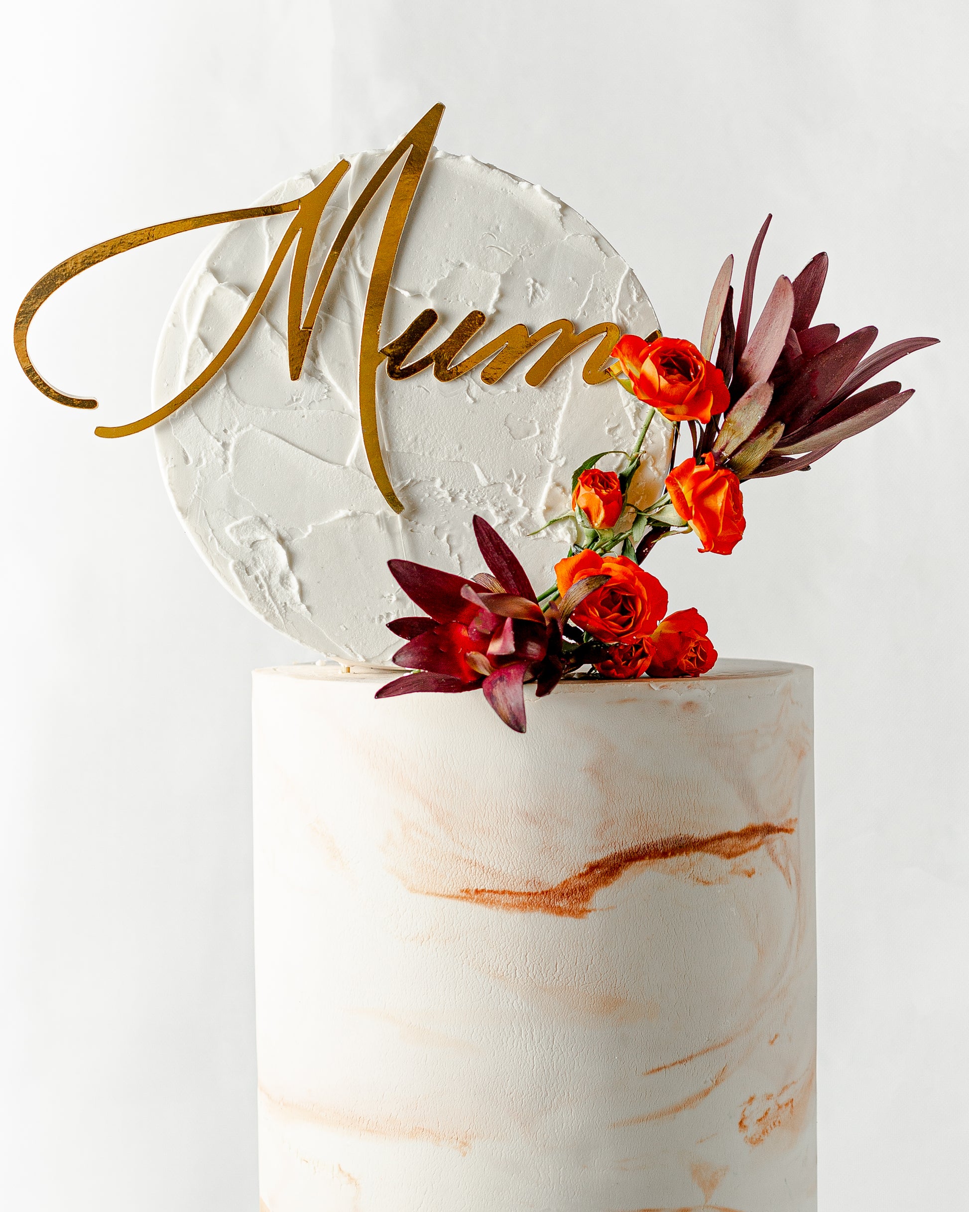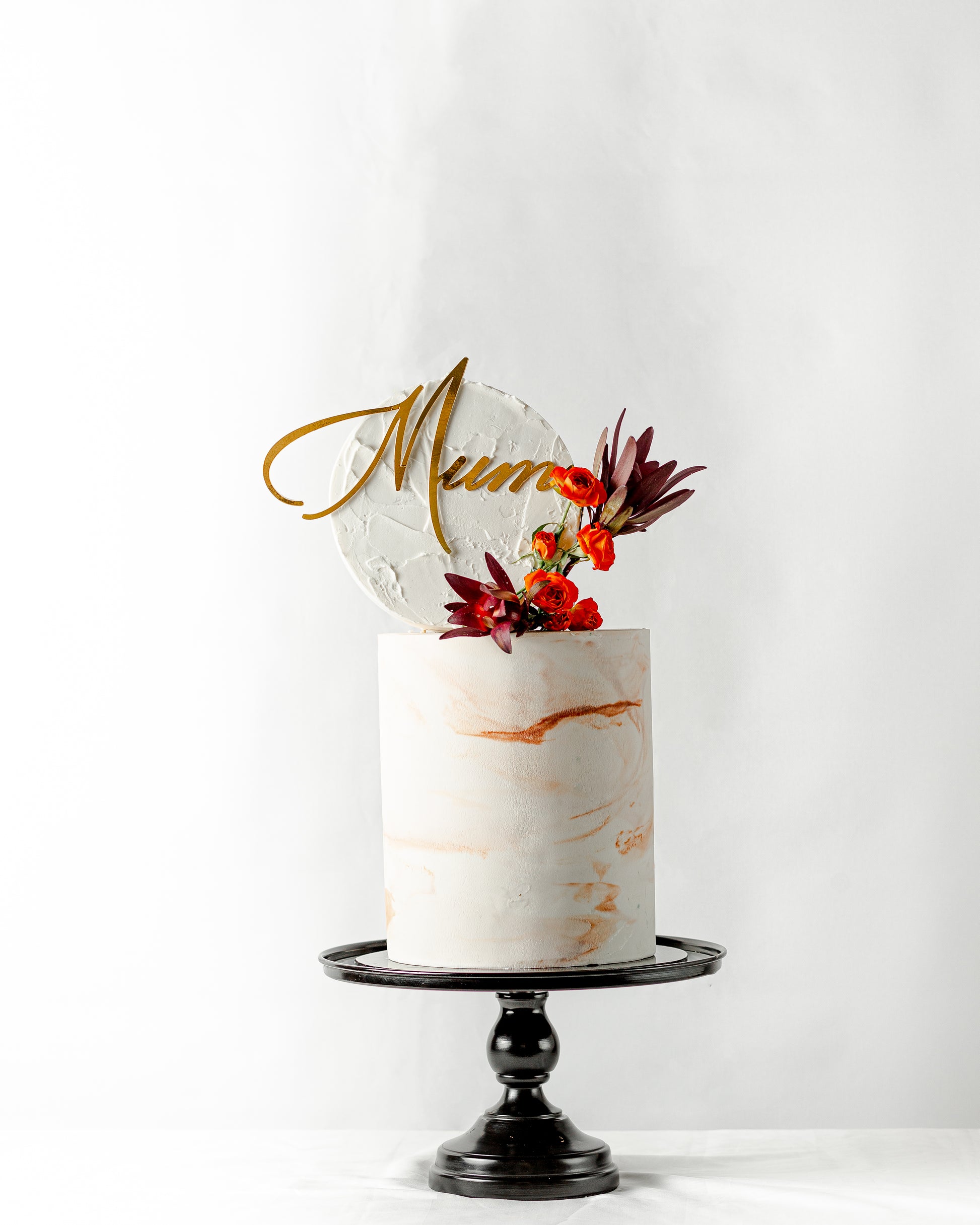 Dear Mum is a heartfelt, single-tier design wrapped in soft peach-toned marble with a velvet matte finish. A gold “Mum” topper adds personal warmth, while vivid red-orange florals and deep plum foliage create a bold yet graceful accent. Perfect for birthdays, Mother’s Day, or honoring her at intimate gatherings. Customize with her favorite colors or a handwritten message.