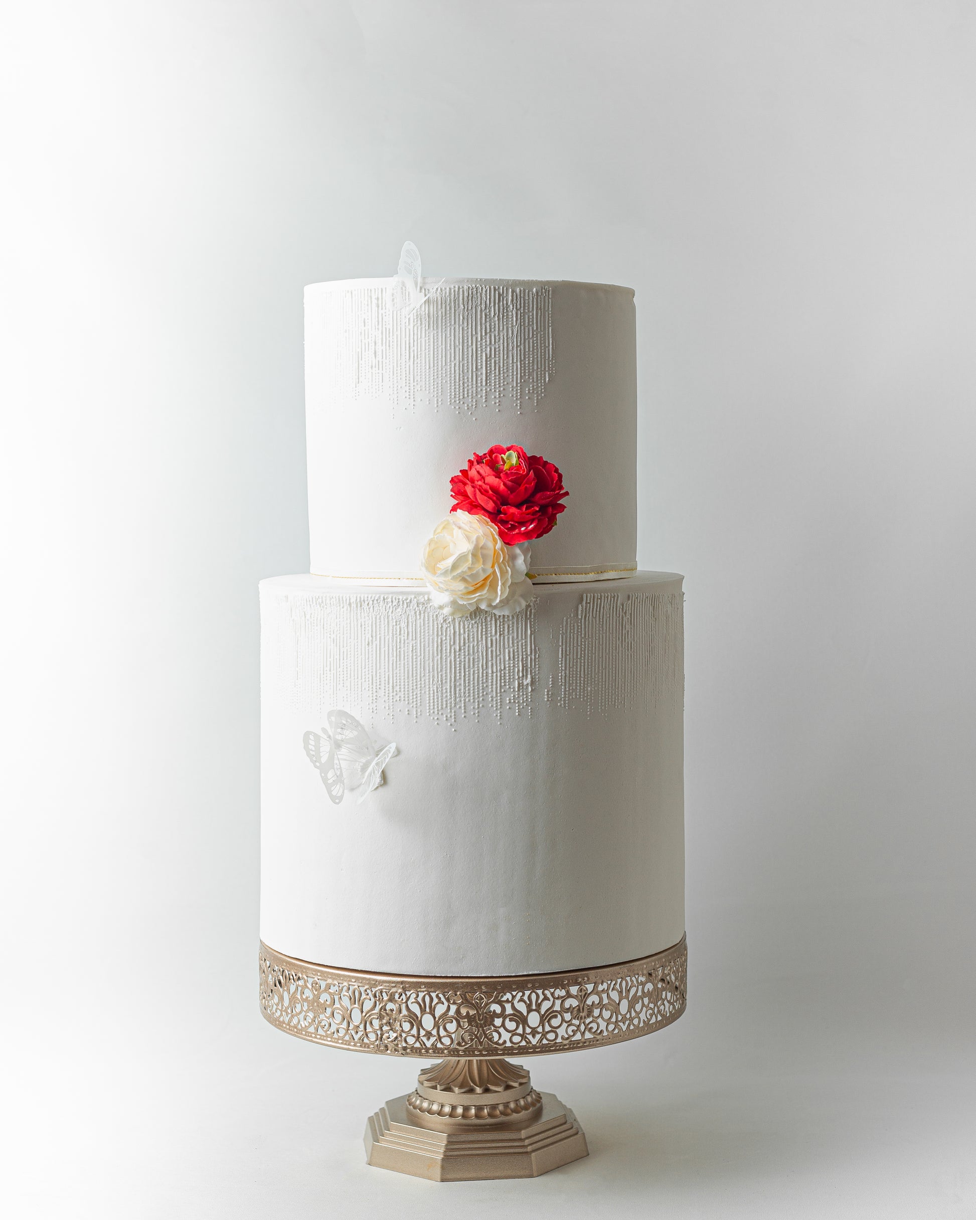 Ever After is a classic two-tier white cake with delicate vertical texture, accented by red and ivory sugar blooms and soft butterfly details. Refined and romantic, it's perfect for weddings, anniversaries, or bridal showers. Add initials, color-coordinated florals, or a topper for your storybook ending.