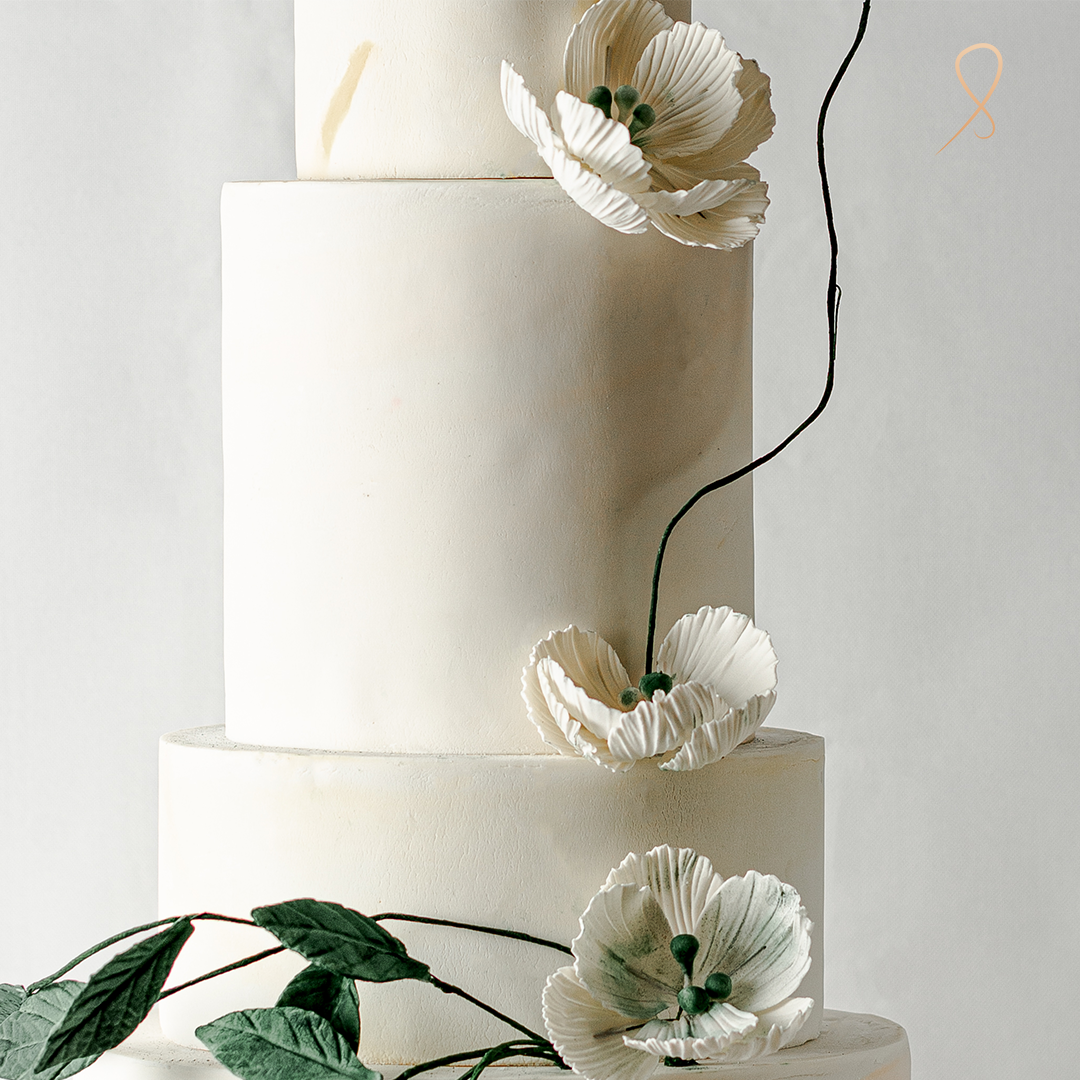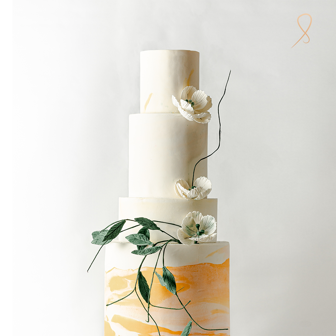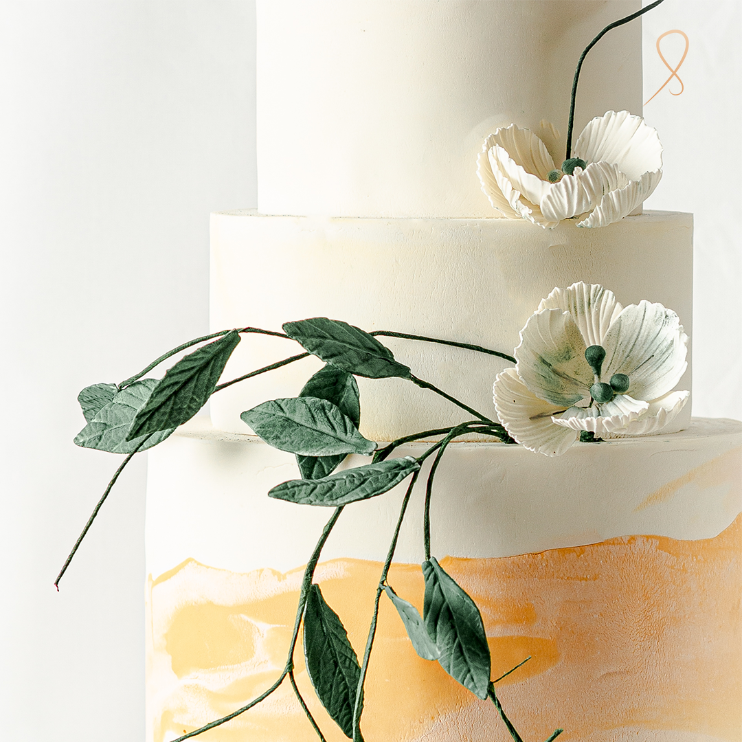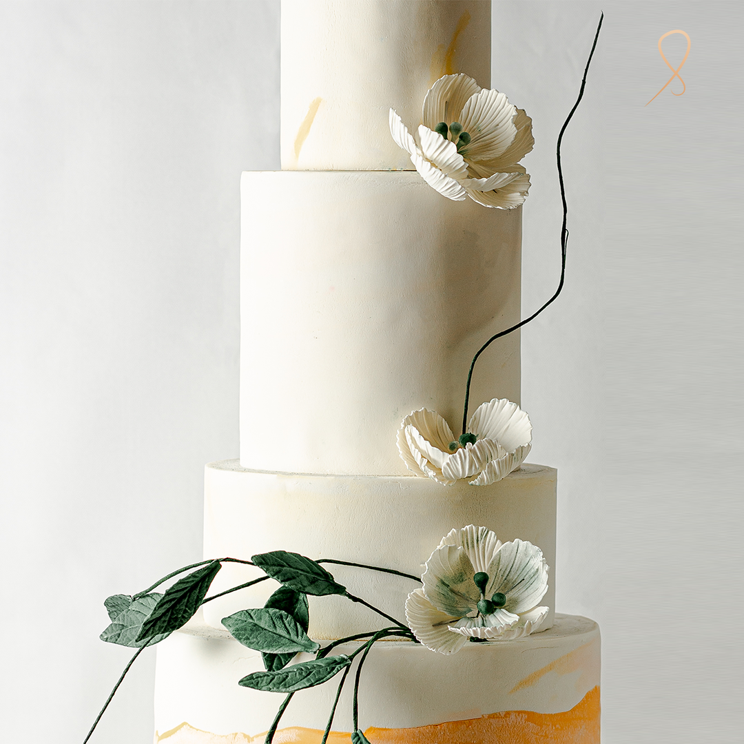 Golden Wisteria pairs a warm marbled base in soft gold and cream with hand-sculpted white florals and sweeping green sugar vines. Its clean structure and botanical accents evoke a refined natural beauty. Ideal for elegant weddings, anniversaries, or elevated garden celebrations.