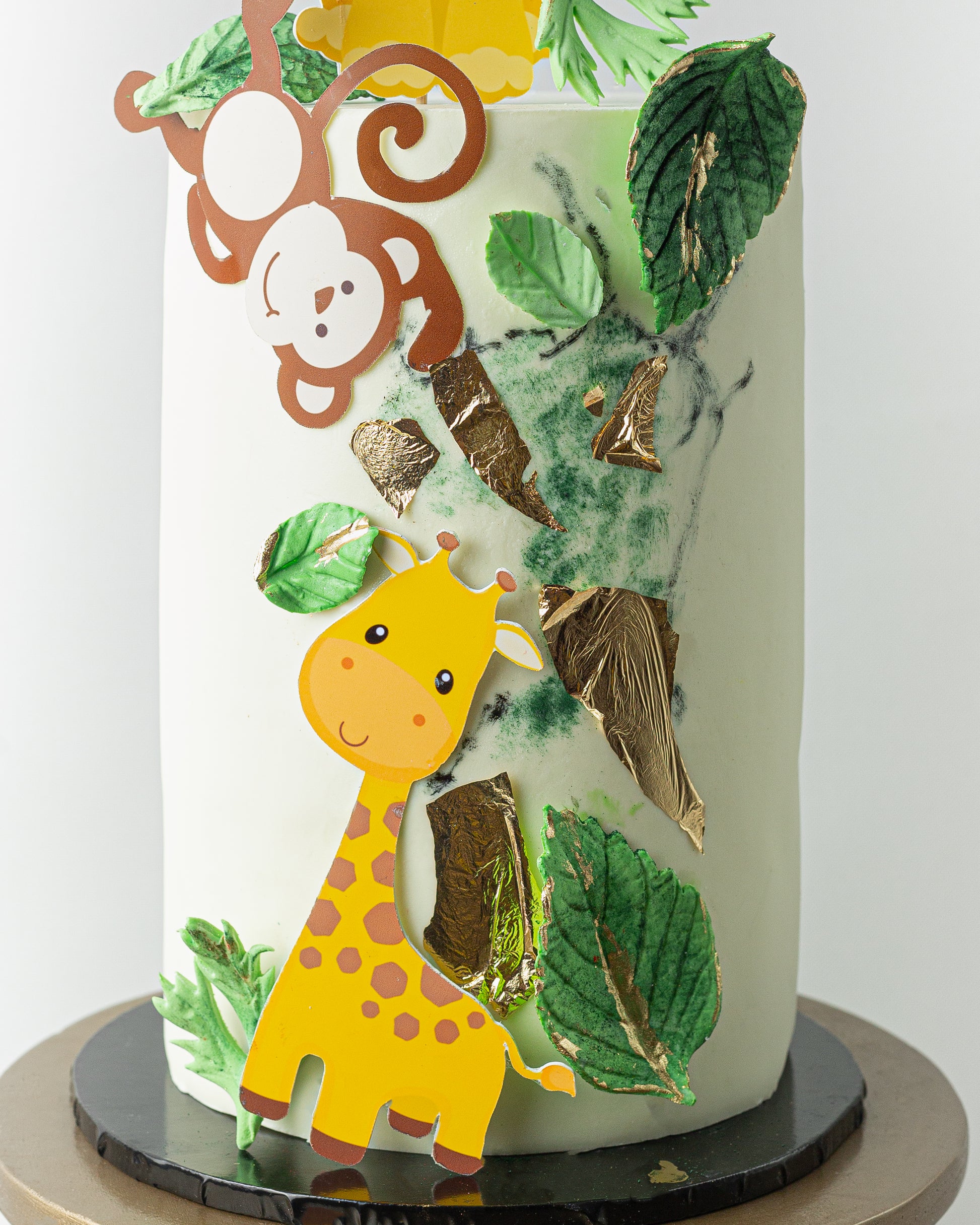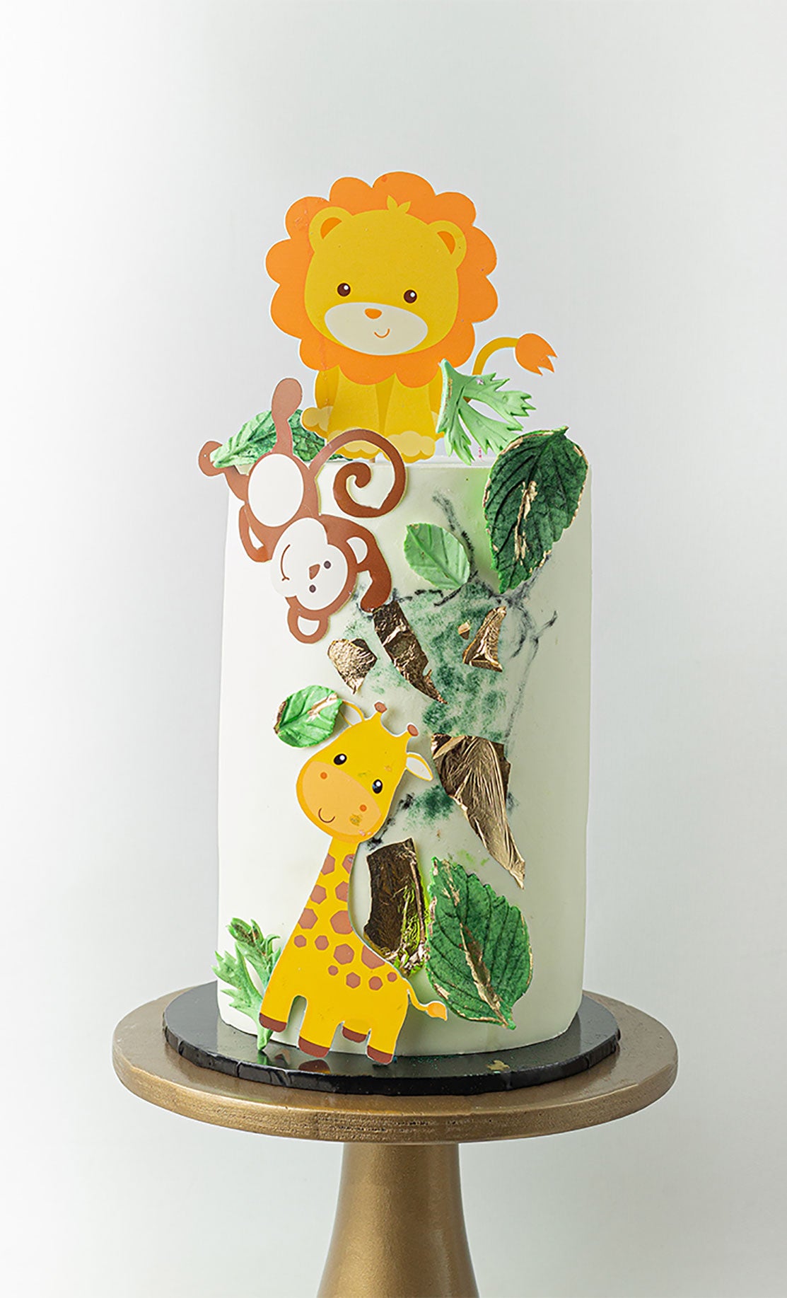 Jungle Joy bursts with character, featuring a tall white base adorned with edible leaves, bark textures, and charming animal toppers like a lion, monkey, and giraffe. It's a fun, photo-ready centerpiece for birthday parties or baby showers. Personalize it with a name, age, or themed topper to make it truly yours.