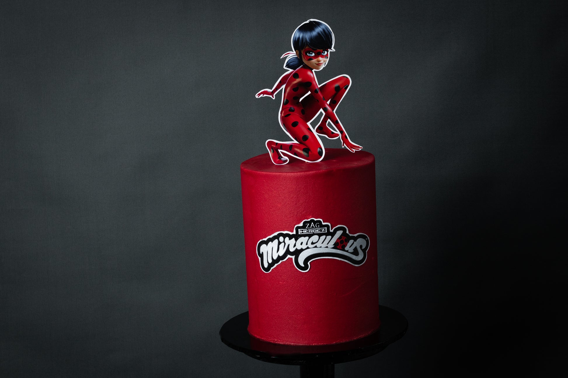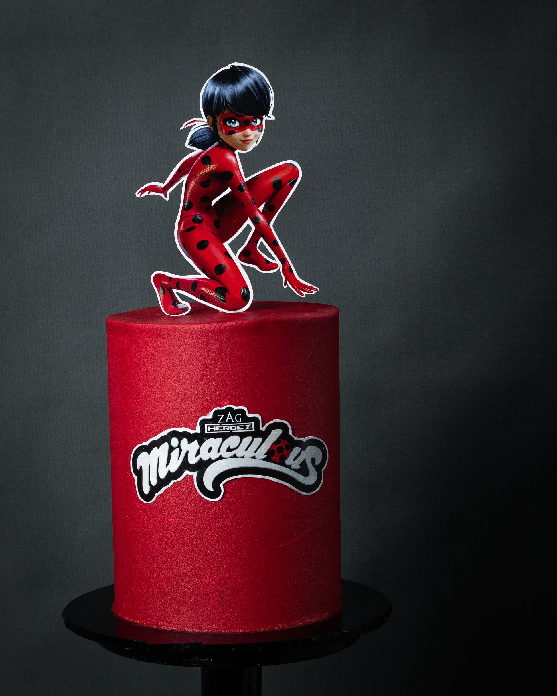 Ladybug Leap features a smooth, deep red fondant finish with a striking cutout topper of everyone's favorite superhero, Ladybug. Finished with the official Miraculous logo, this cake brings energy and adventure to center stage. Perfect for kids' birthdays and themed parties.