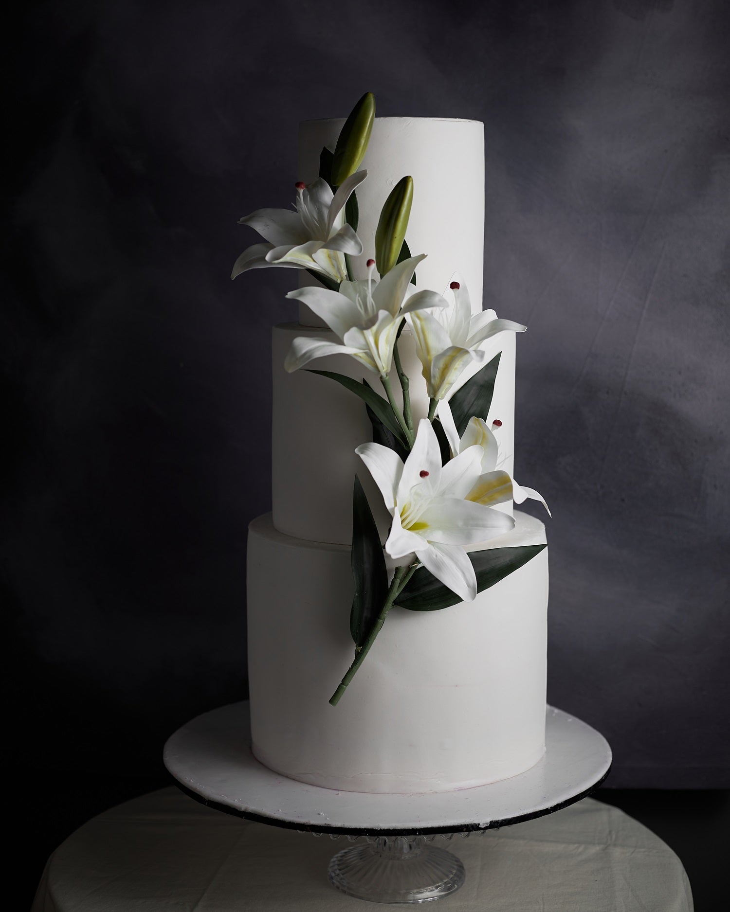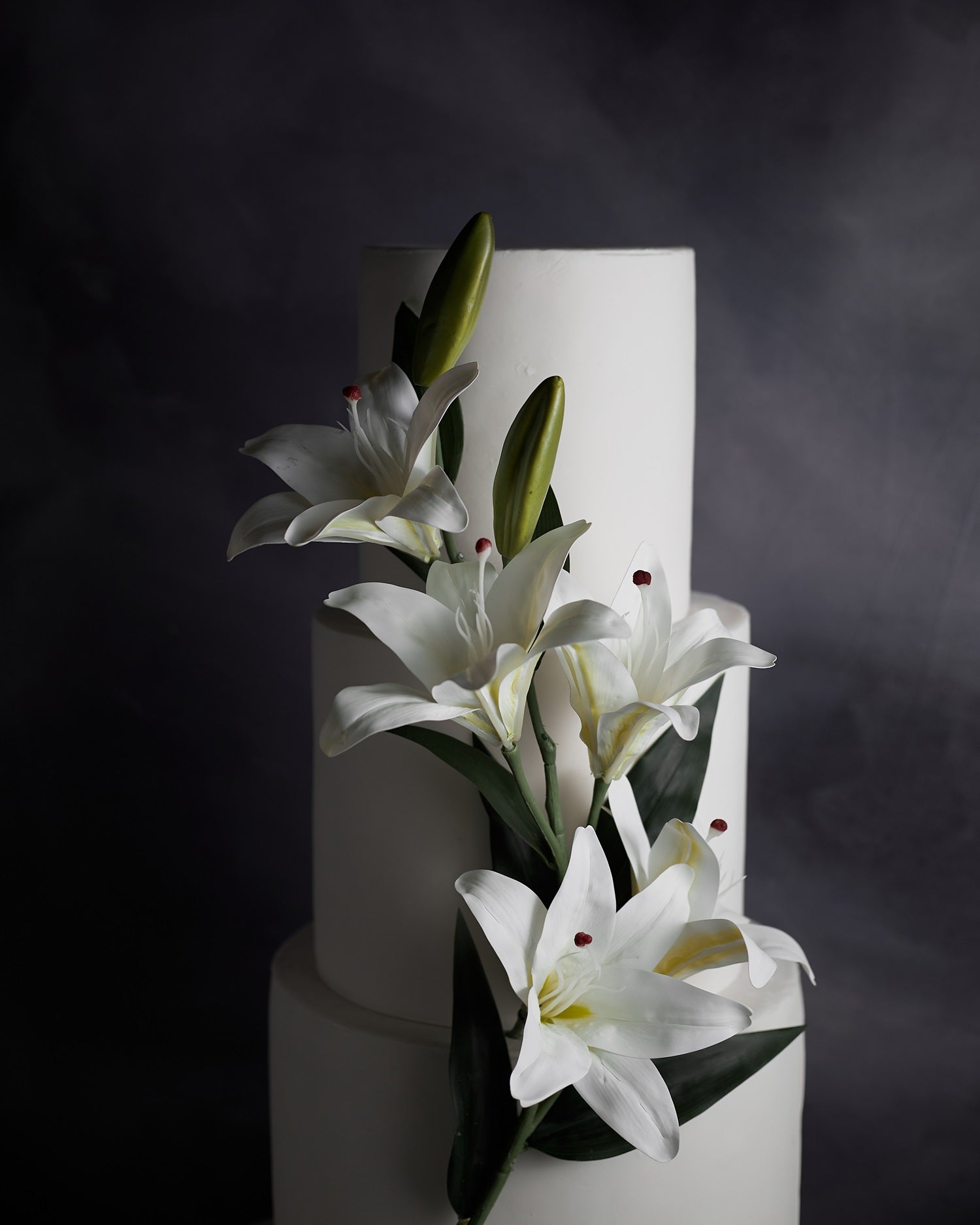 Lily Grace features a smooth white canvas adorned with delicate, hand-crafted lilies flowing gently down its tiers. The minimalist design exudes purity and poise, making it a refined centerpiece for weddings, memorials, and christenings. Personalize it with a name, date, or topper to mark your special day with quiet beauty and grace.