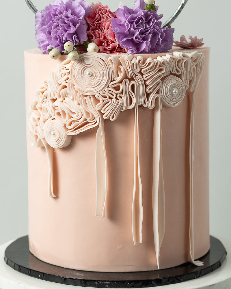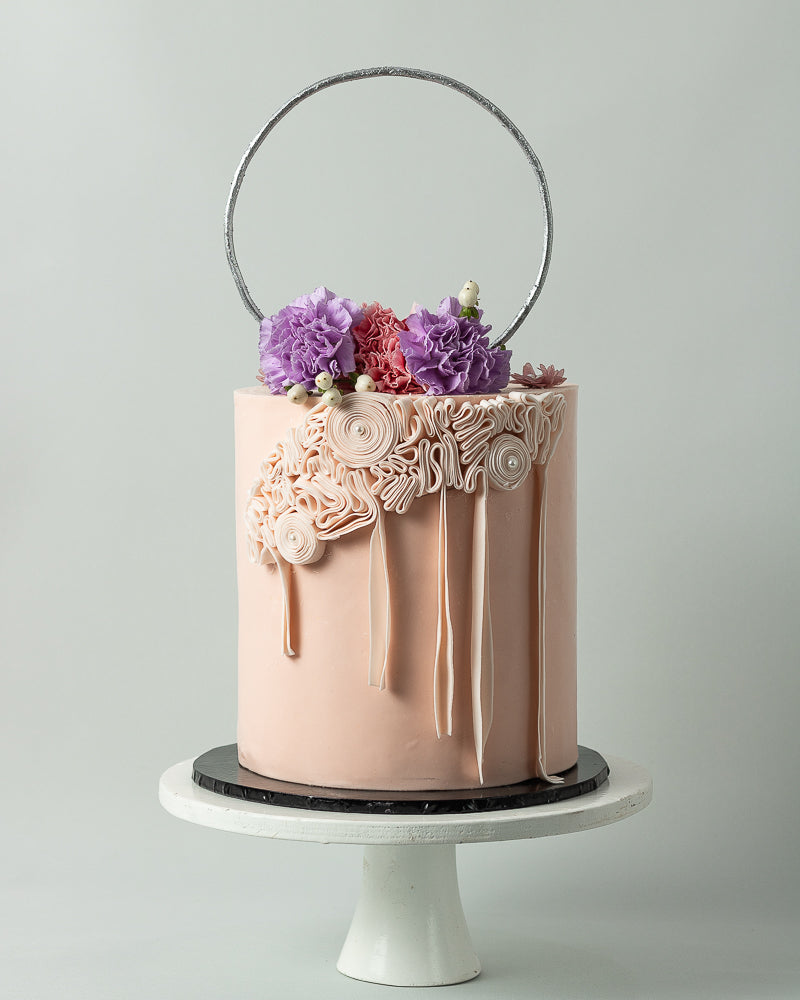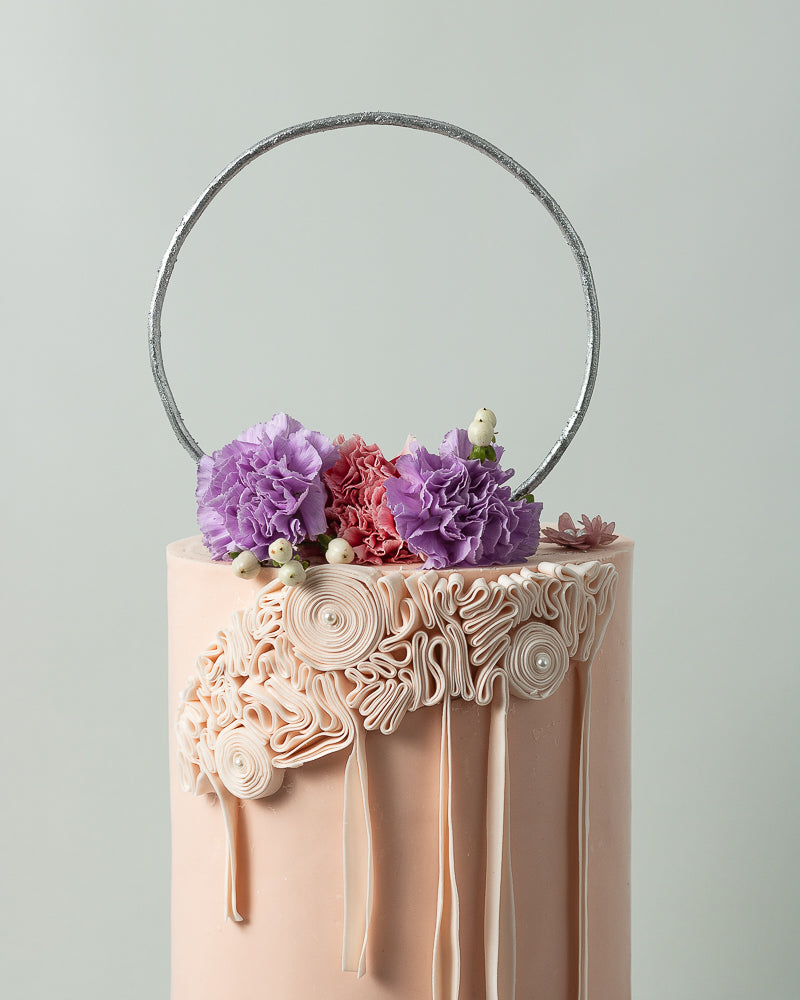 Looped in Love balances softness and structure. Wrapped in blush fondant, it features delicate ribbon-like loops, intricate fondant swirls, and a sleek silver hoop topper crowned with fresh florals in lavender and coral. It's a refined statement for weddings, engagements, or milestone birthdays.