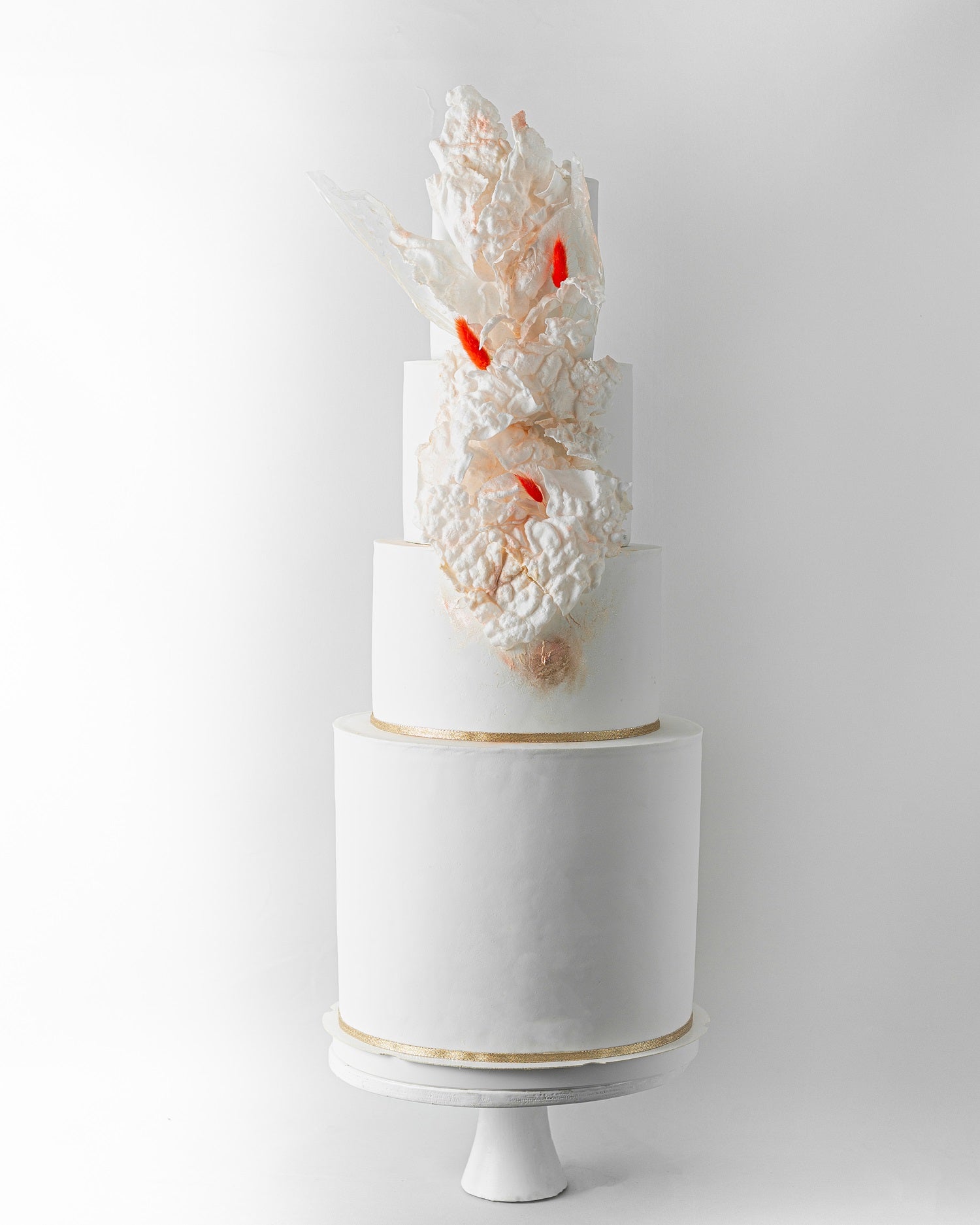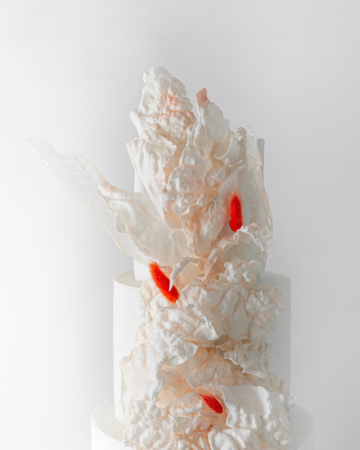 Lustre Bloom is a visual poem in texture and light. Clean white tiers are adorned with an abstract sugar sculpture resembling coral or flame, brushed with soft blush, pearl shimmer, and hints of gold. A piece for modern romantics and bold dreamers. Ideal for weddings or artful events.