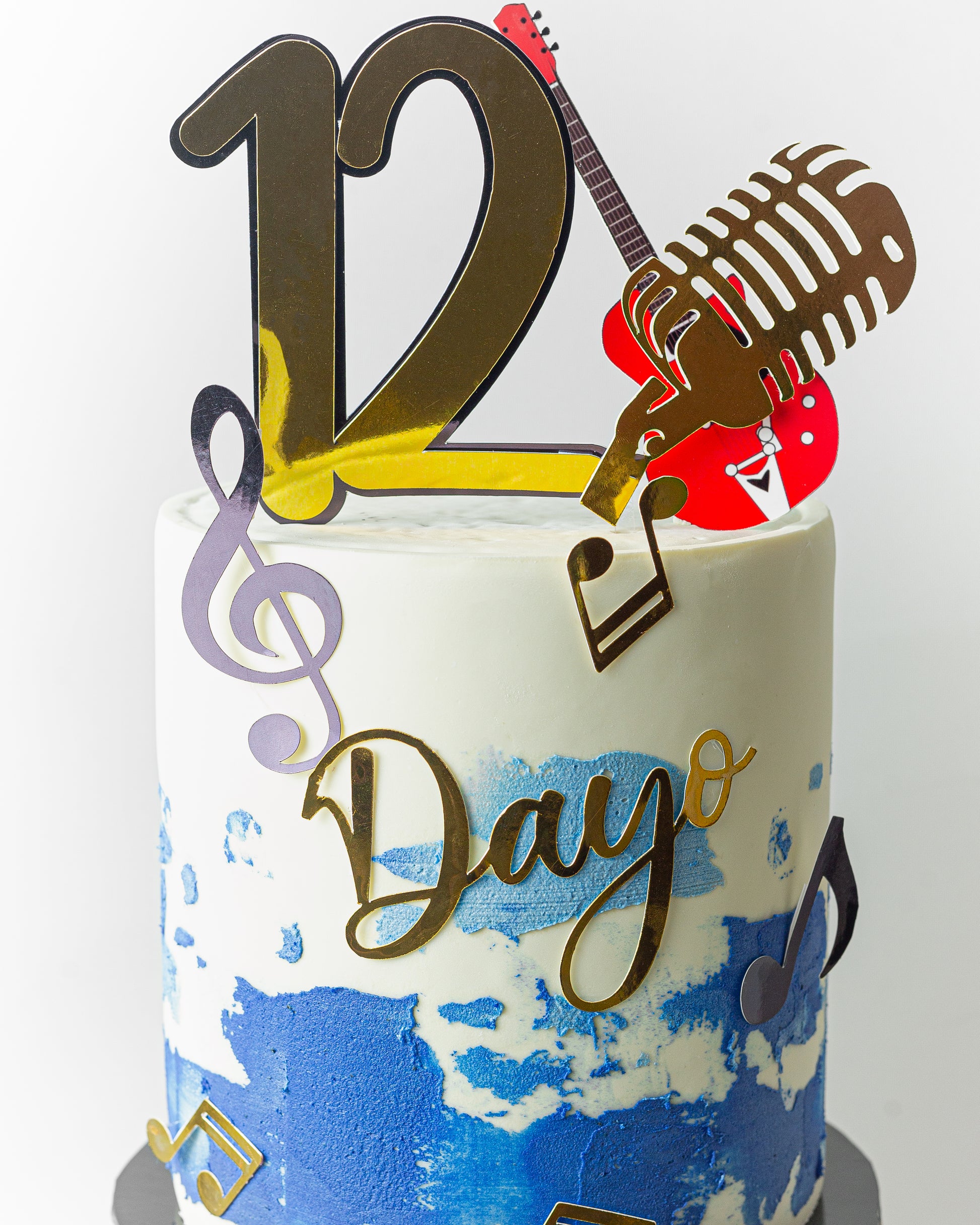Mic Drop is a vibrant, high-energy cake with electric blue brush strokes, gold accents, and music note toppers. A bold mic, number topper, and custom name make it ideal for music lovers and birthday headliners. Customize colors, instruments, or age to hit the perfect note.