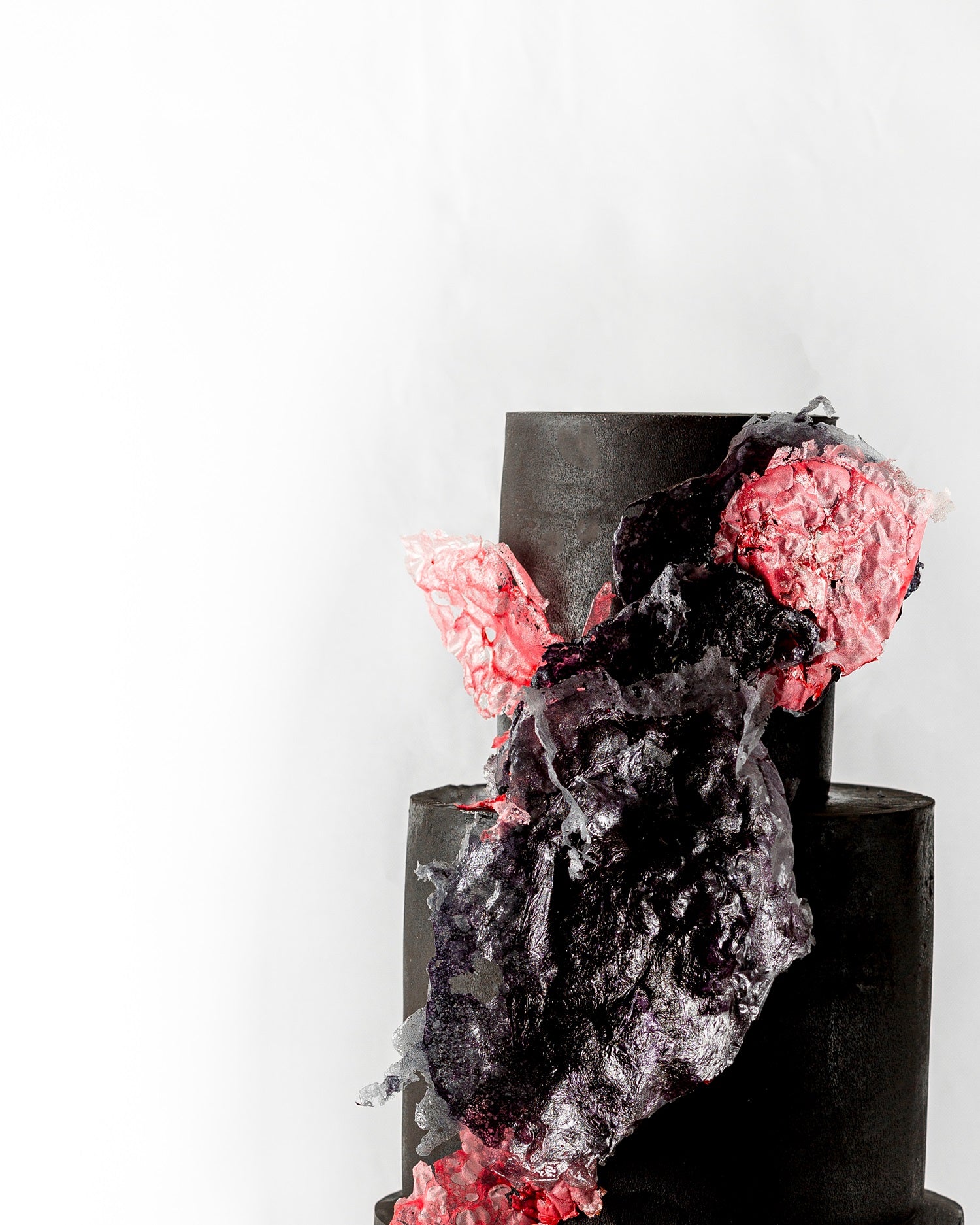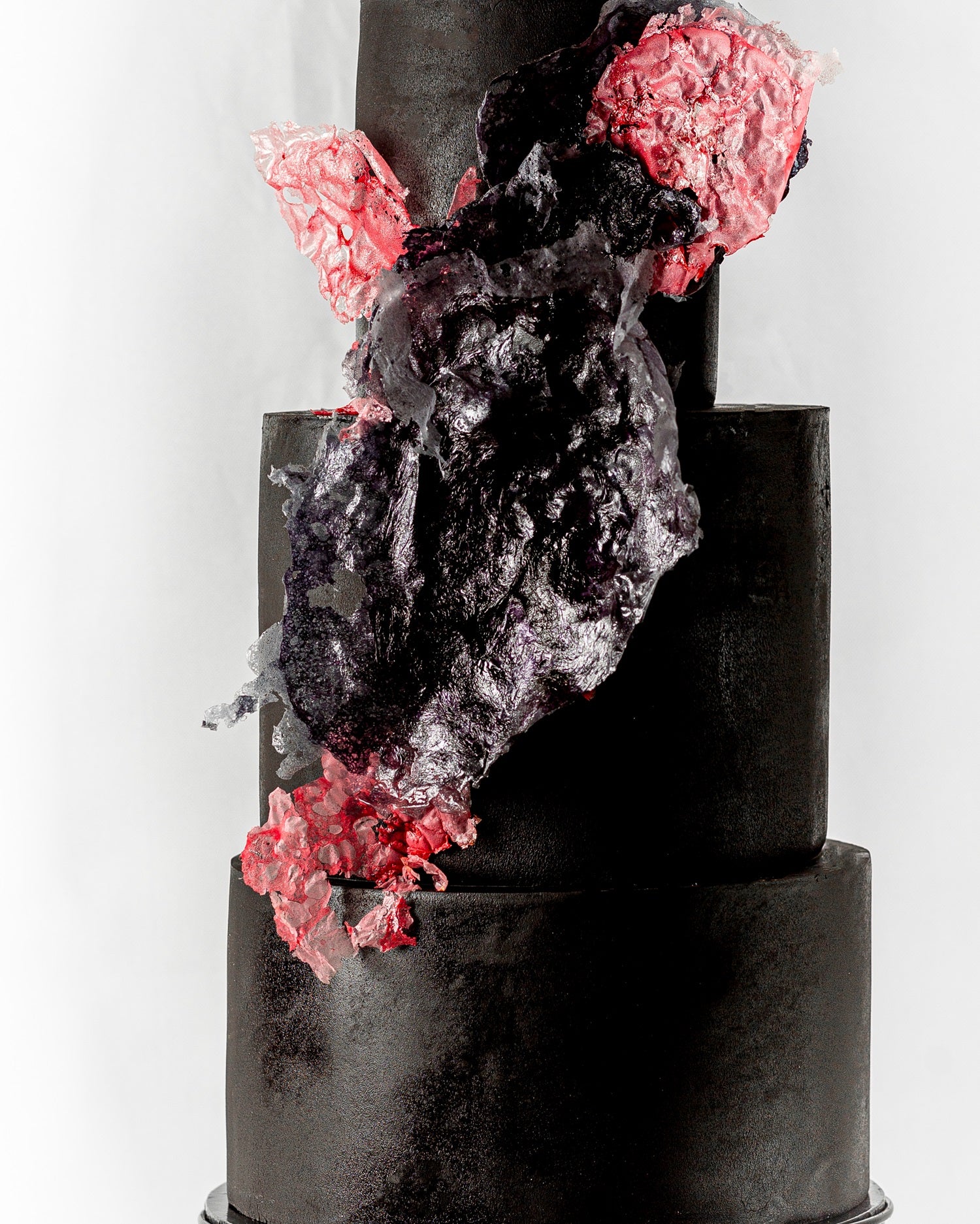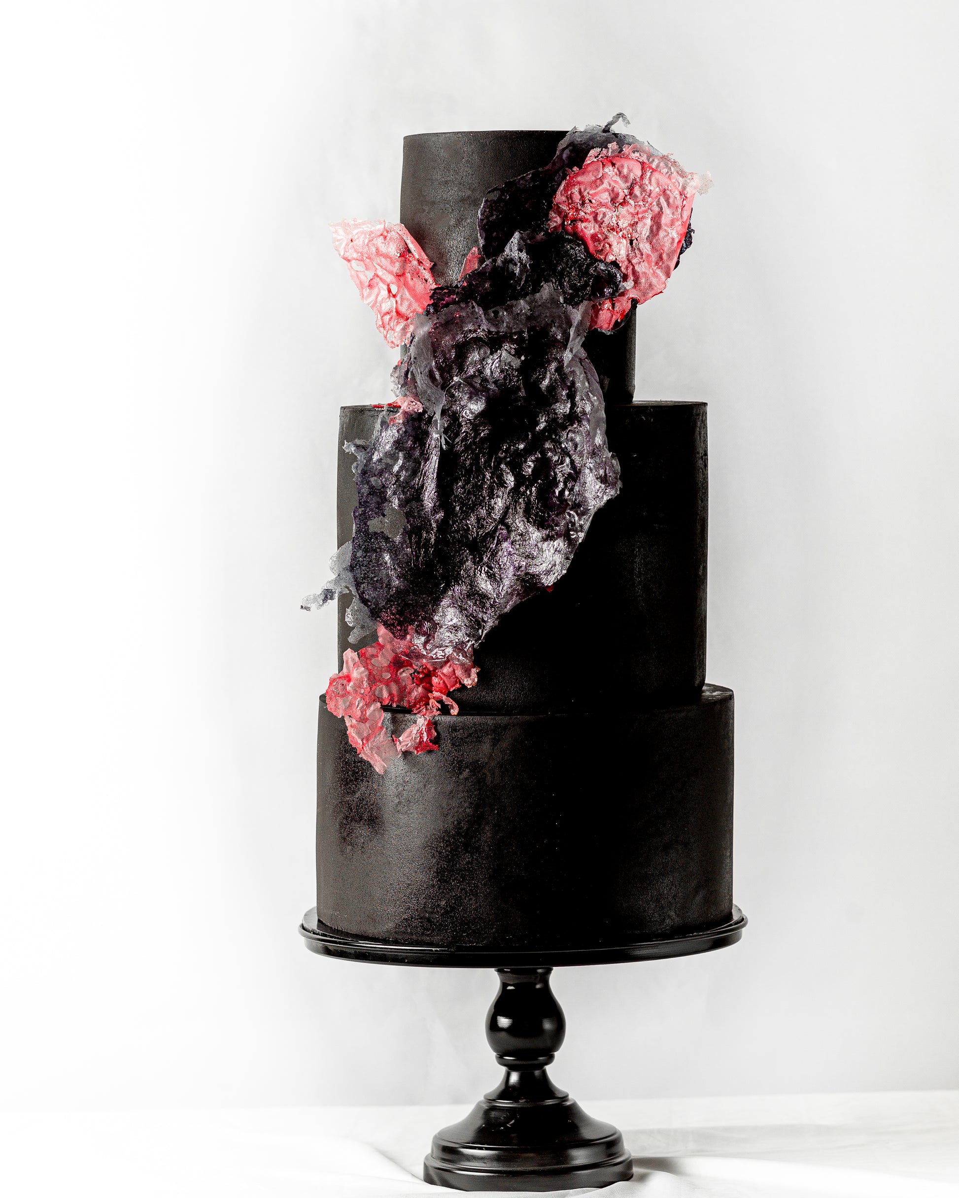 Midnight Shatter is unapologetically bold, featuring matte black tiers and a cascade of hand-sculpted edible sugar textures in deep violet and electric crimson. The jagged sugar shards glisten like crystalized lava commanding attention from every angle. Designed for modern weddings, fashion events, or milestone parties with a fierce flair. Add initials, metallic accents, or custom colors.