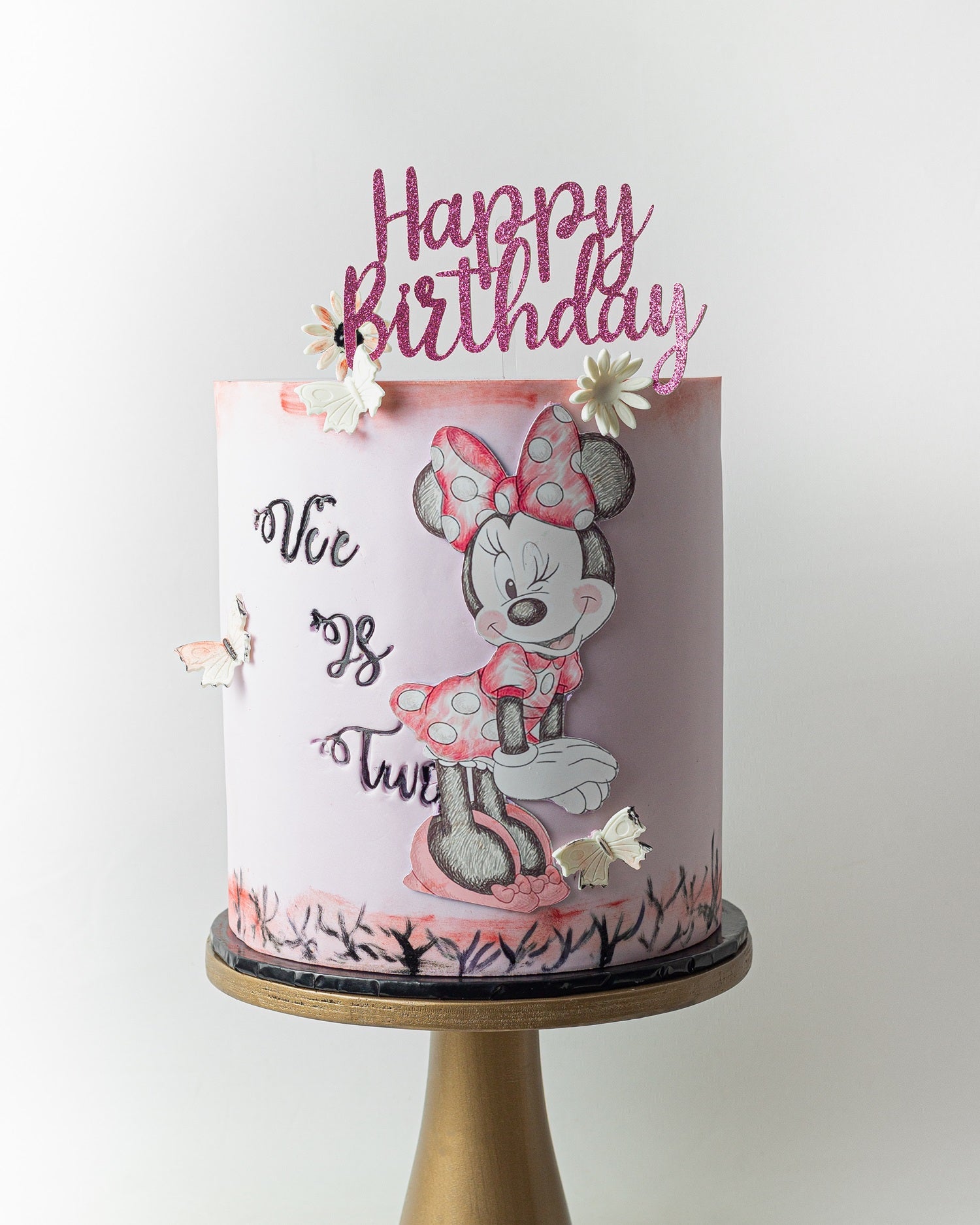 Minnie Moments is the perfect pink celebration for Minnie Mouse fans. With delicate butterfly details, soft pink accents, and a hand-drawn Minnie in her signature bow, this cake adds charm and joy to any birthday. Personalize with a name, age, or topper to make it even more special.