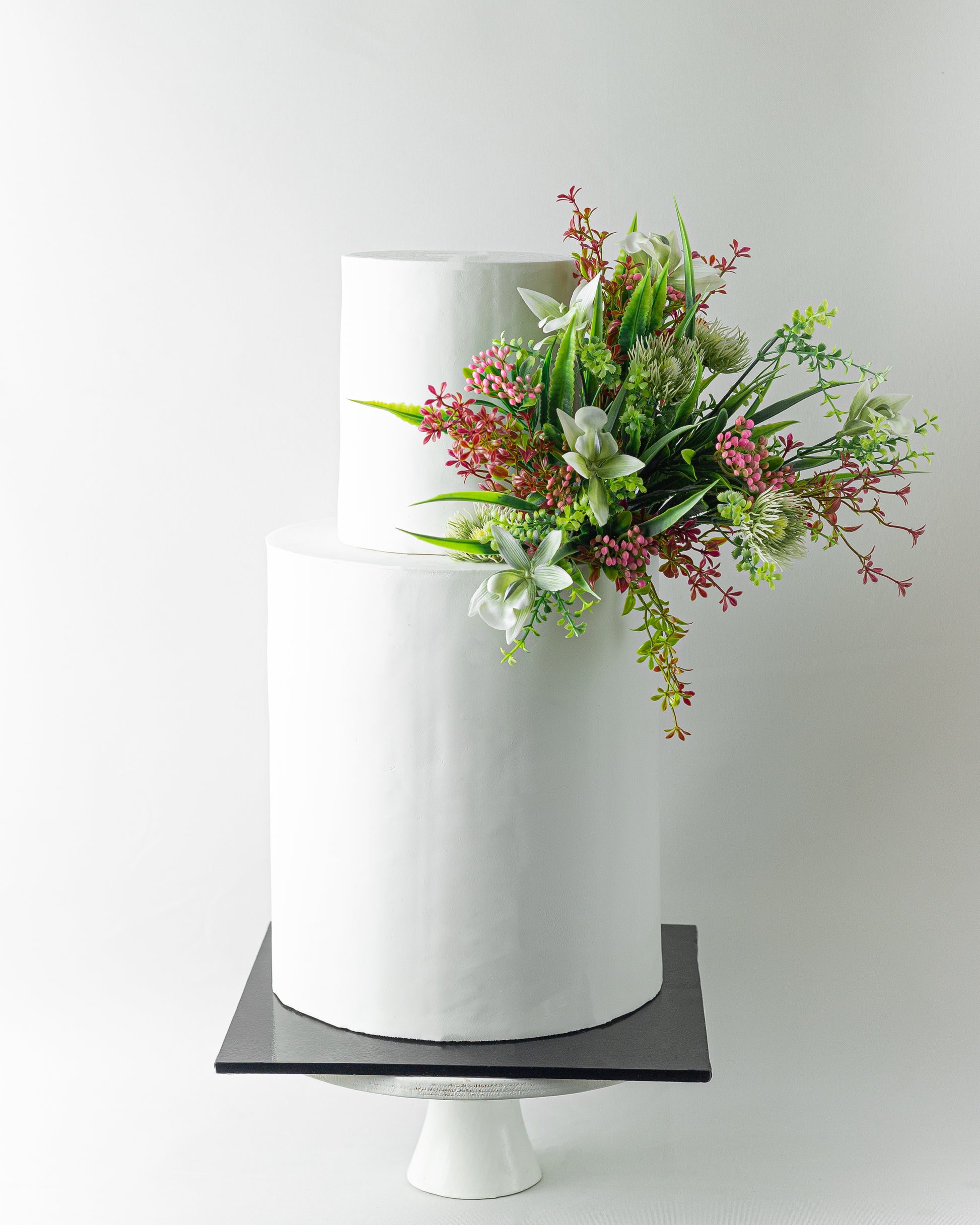 Moss Tarta pairs crisp white fondant with a vibrant burst of botanicals. Featuring two tall, minimalist tiers, this design is both modern and romantic. The asymmetrical floral arrangement adds life, texture, and artful movement. Perfect for weddings, anniversaries, or garden parties. Add a topper or a soft color wash to make it yours.
