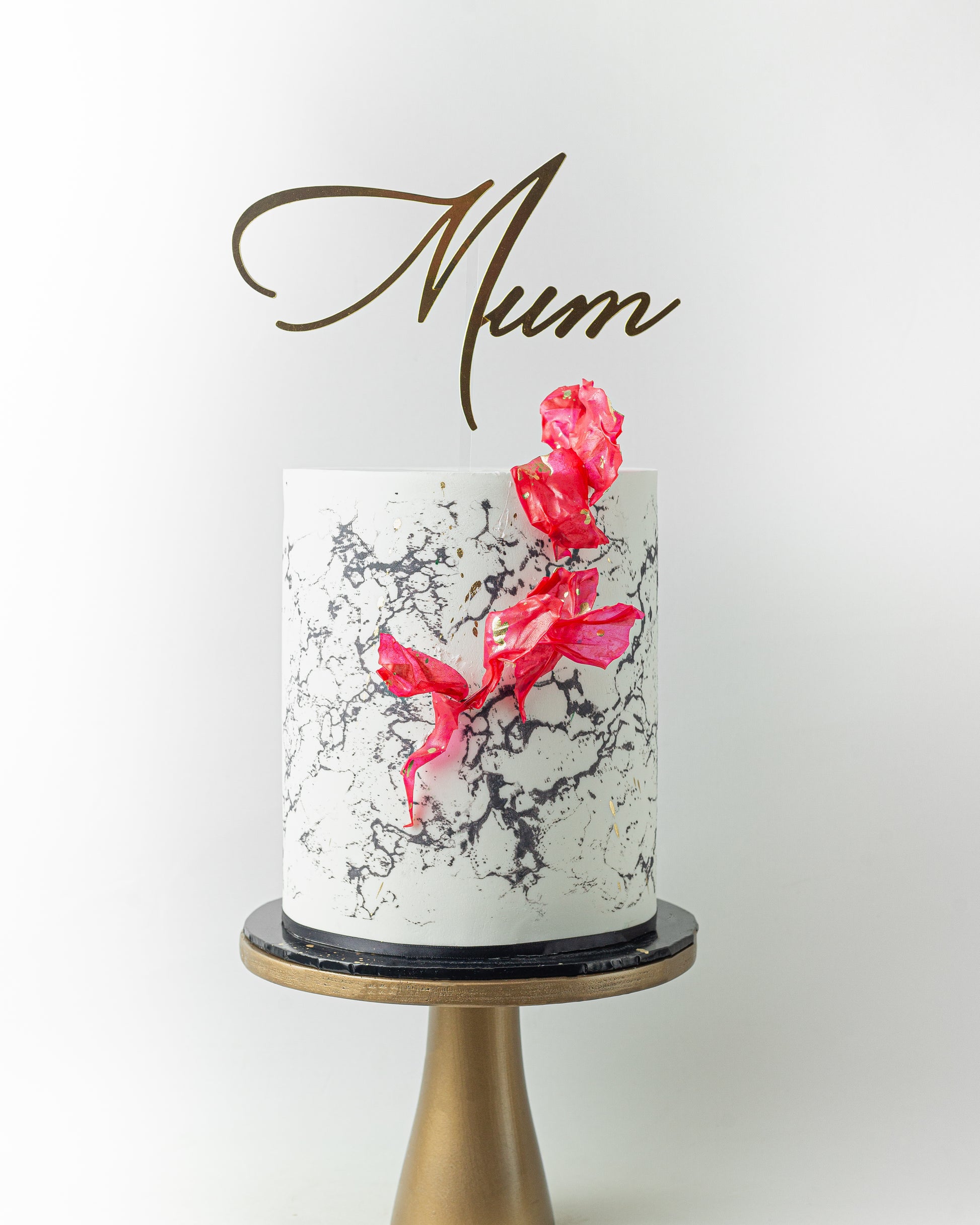 Mum’s Marble is a modern beauty with a white base and sleek black marbling, elegantly topped with vivid pink sugar florals. Finished with a stylish "Mum" topper, it’s perfect for celebrating moms in style. Customize with her favorite colors or a personal message to make her day unforgettable.