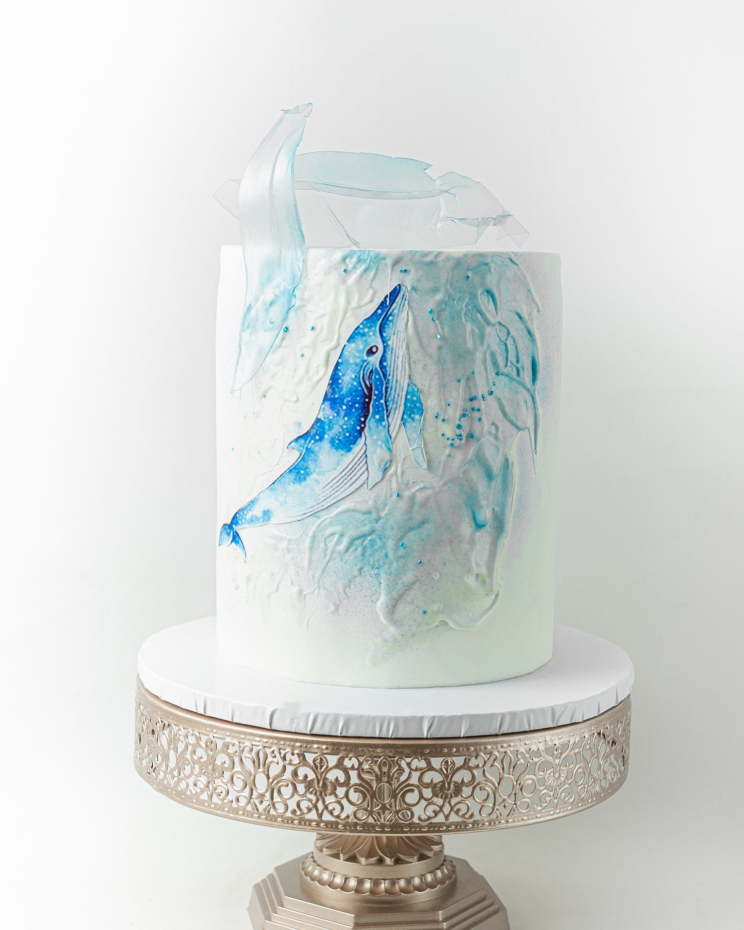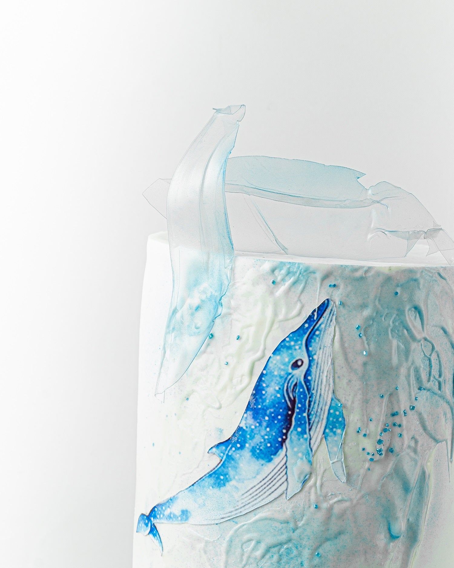 Ocean Whirl is a stunning sea-themed cake with painted blue whales, pearlescent textures, and dramatic sugar-glass shards on top. Designed for ocean lovers, birthdays, or creative celebrations. Available in custom marine colors or with personalized sea creatures.
