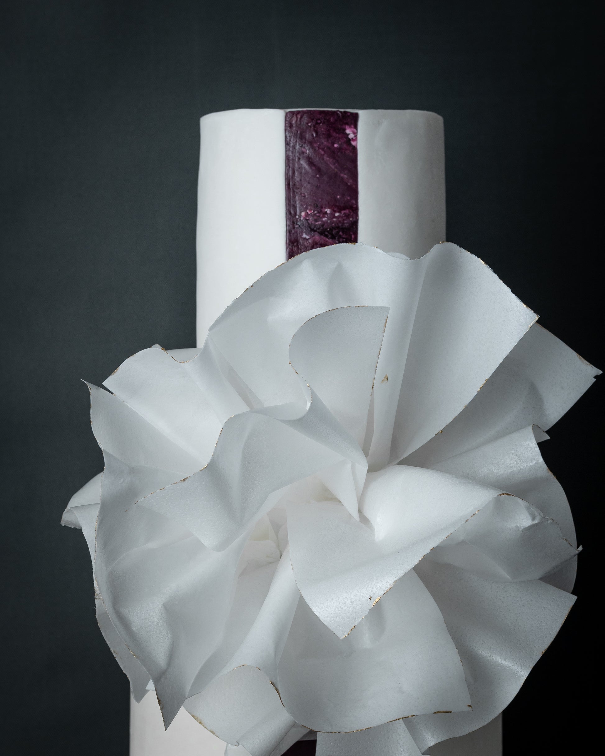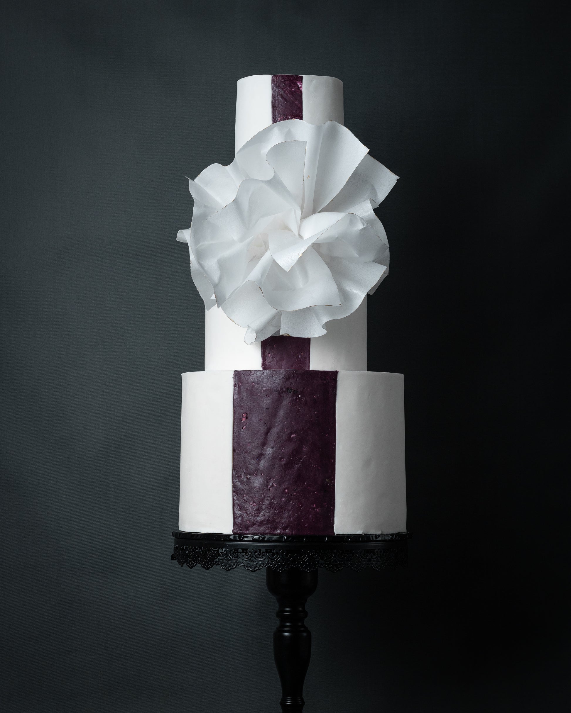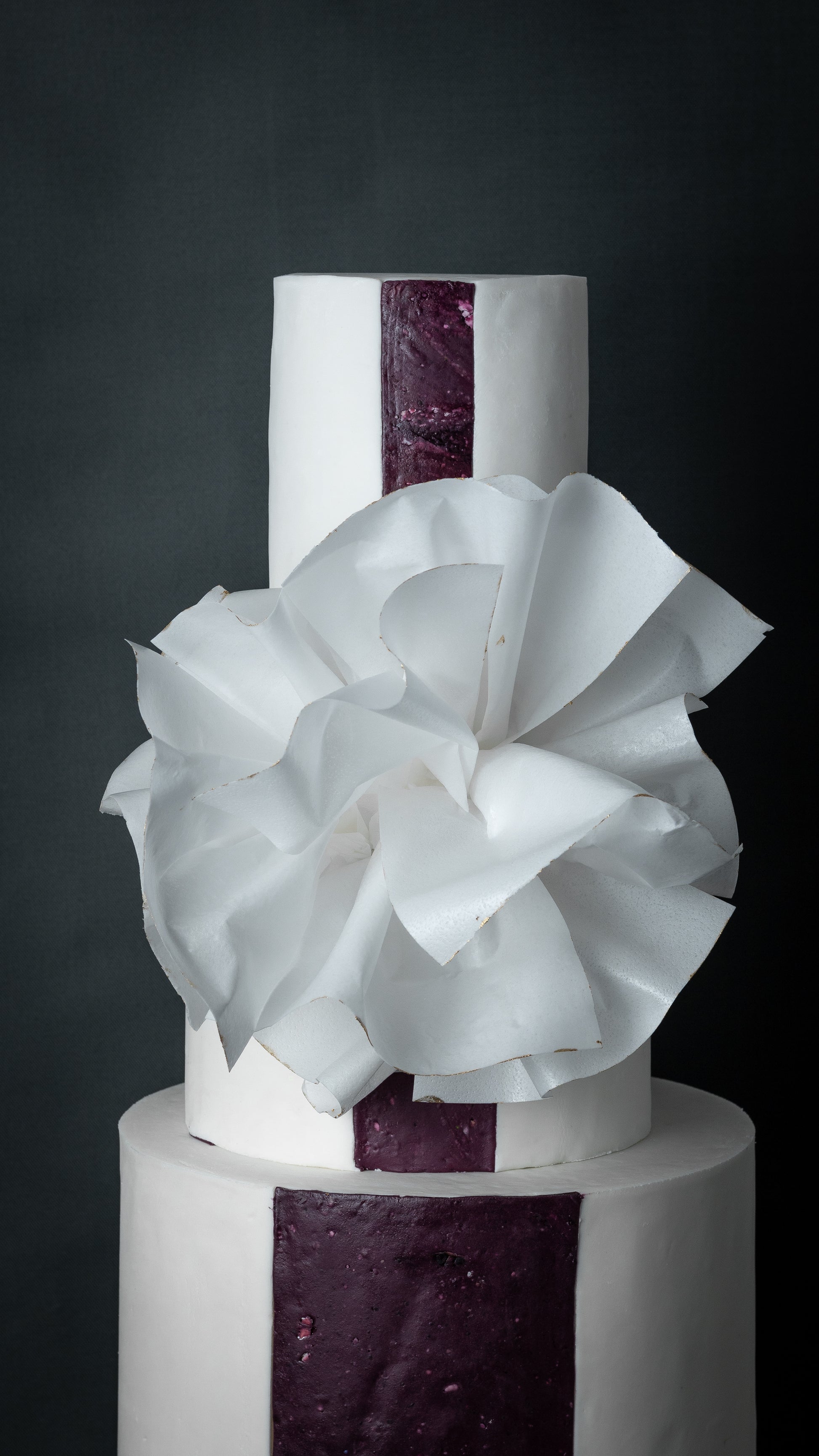Petal Column is a study in structure and grace. Smooth white fondant is paired with vertical plum-textured insets, anchored by an oversized, hand-sculpted sugar bloom. Its clean lines and dramatic flower make it ideal for contemporary weddings or high-design events. Personalize with alternate color accents, blooms, or tier sizing.