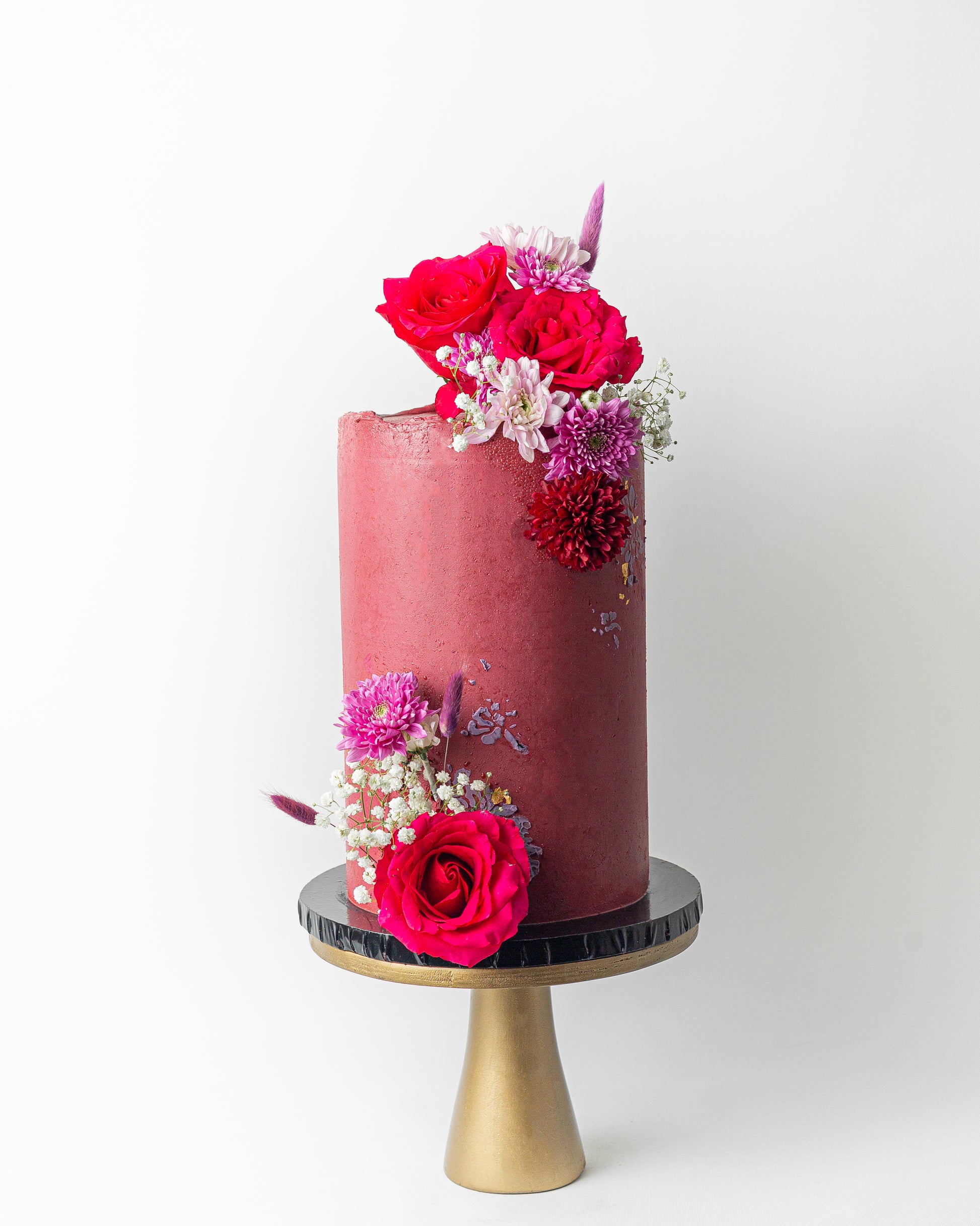 Rosé Grace stuns in rich, matte rose buttercream with subtle silver leafing and sculptural florals. A cascade of vibrant reds, pinks, and soft purples adds texture and lush emotion. This tall, single-tier design is perfect for romantic birthdays, anniversaries, or heartfelt moments. Personalize with a topper, message, or custom color.