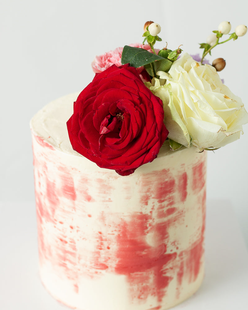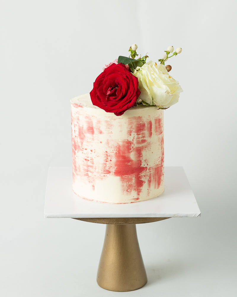 Rosé Whisper features a delicate red brushstroke finish over soft ivory buttercream, offering a painterly touch of romance. Topped with fresh red and white garden roses and pearl berries, this cake blends classic charm with modern artistry. Perfect for birthdays, bridal showers, or celebrating someone special. Customize with your choice of flowers or a name topper