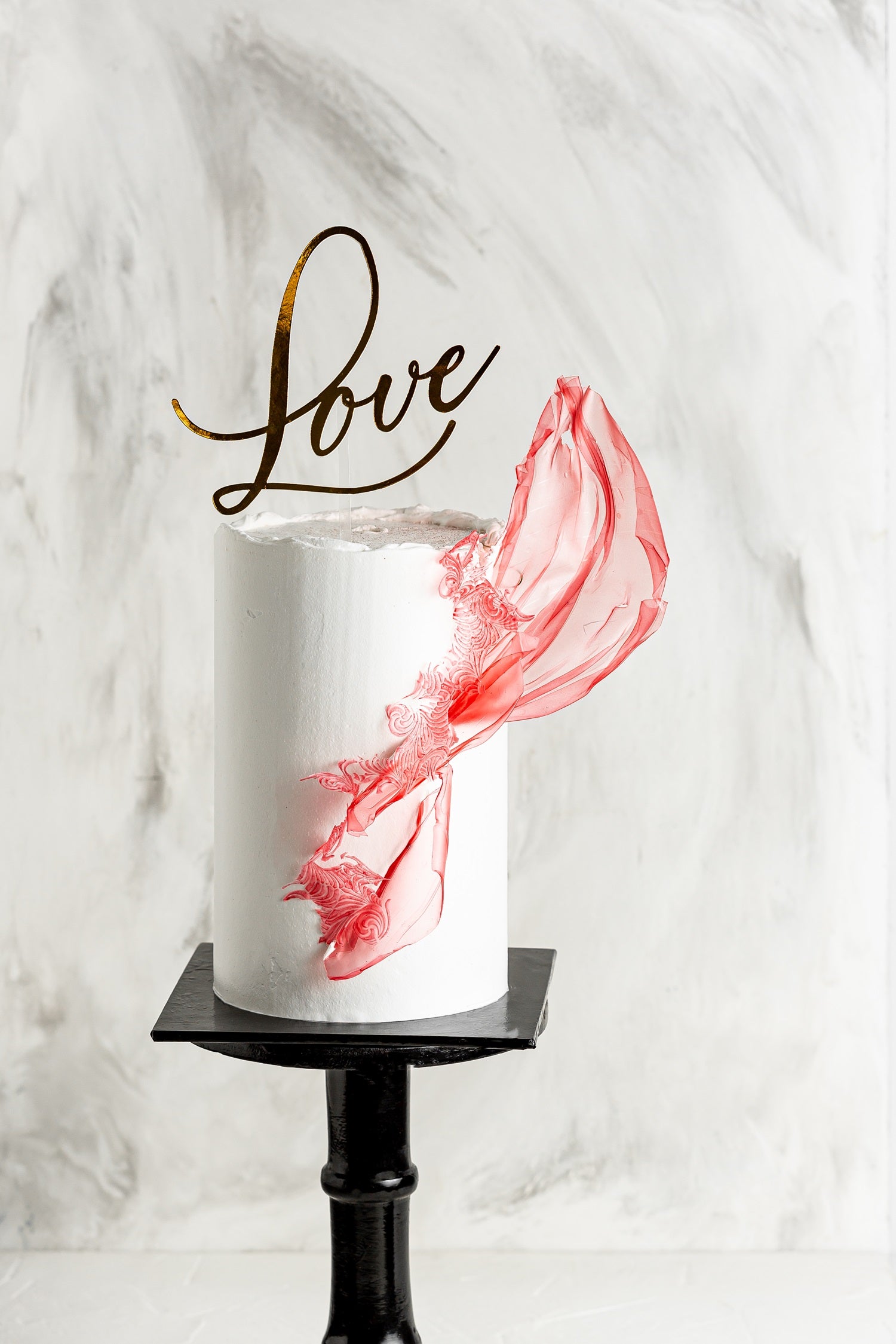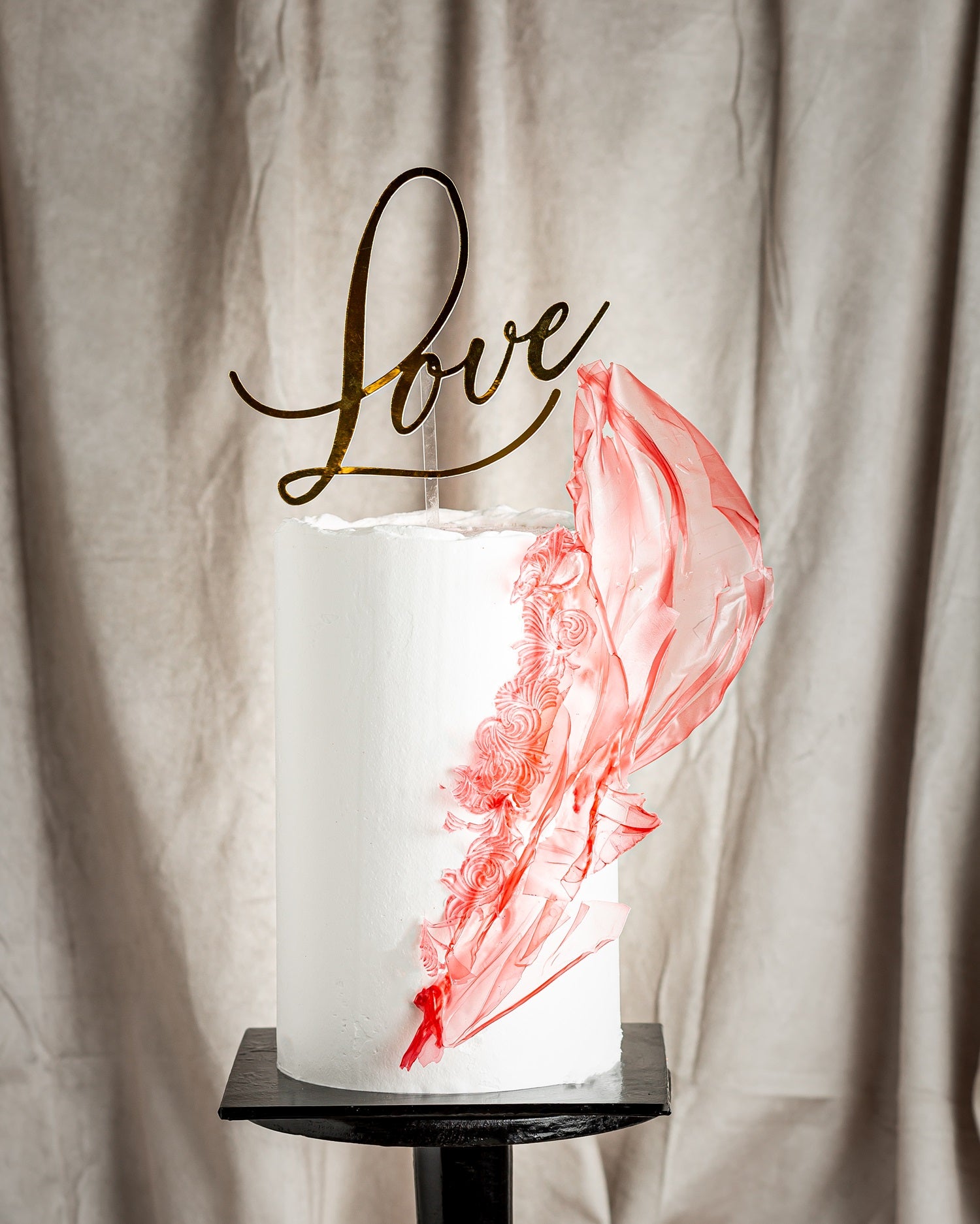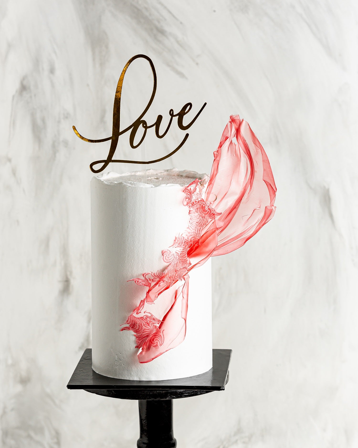 Rose Whirl captures modern romance in motion. A smooth white finish sets the stage for delicate, textured sugar sails in vibrant rose pink, dancing along the side. Topped with a metallic “Love” script, it's a bold yet graceful piece for weddings, engagements, or vow renewals. Personalize with initials, toppers, or color accents.