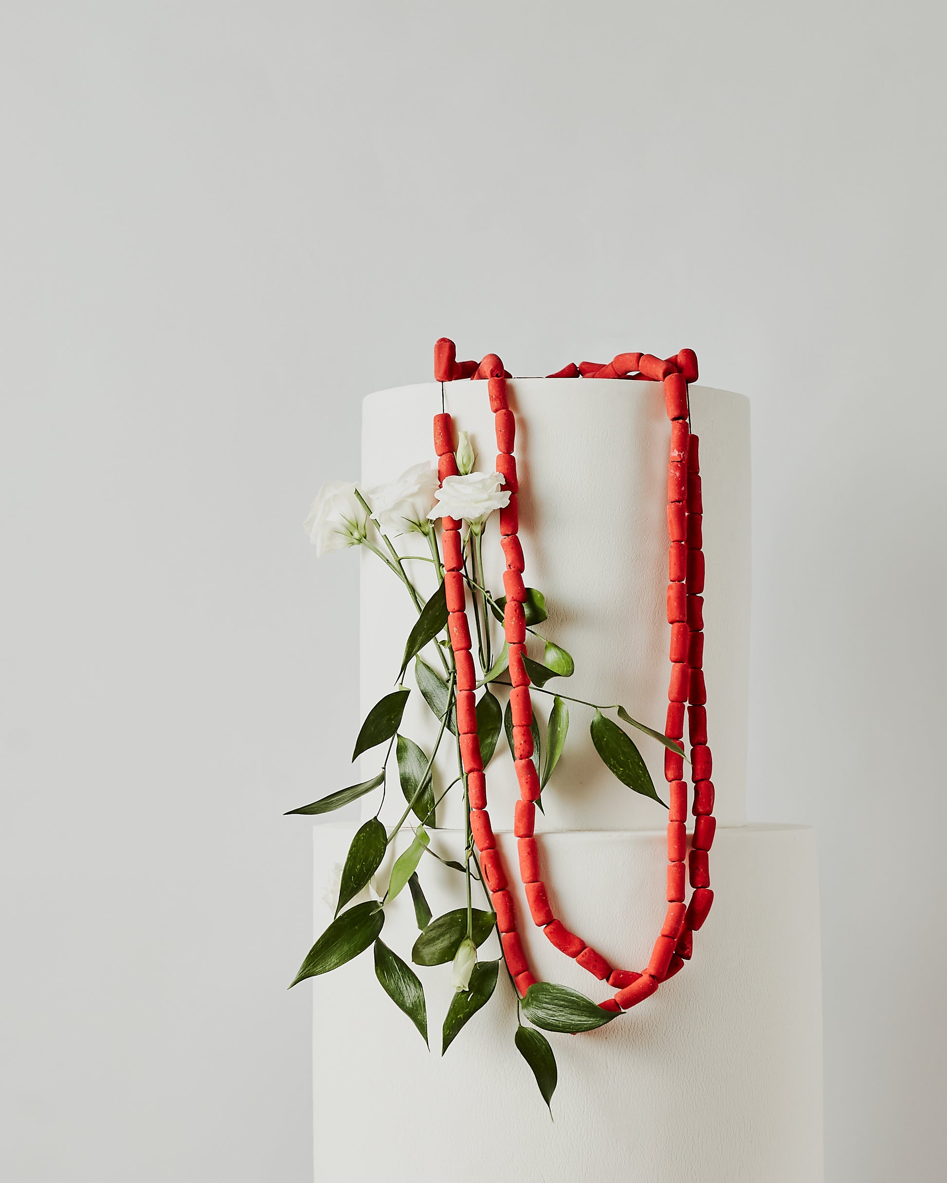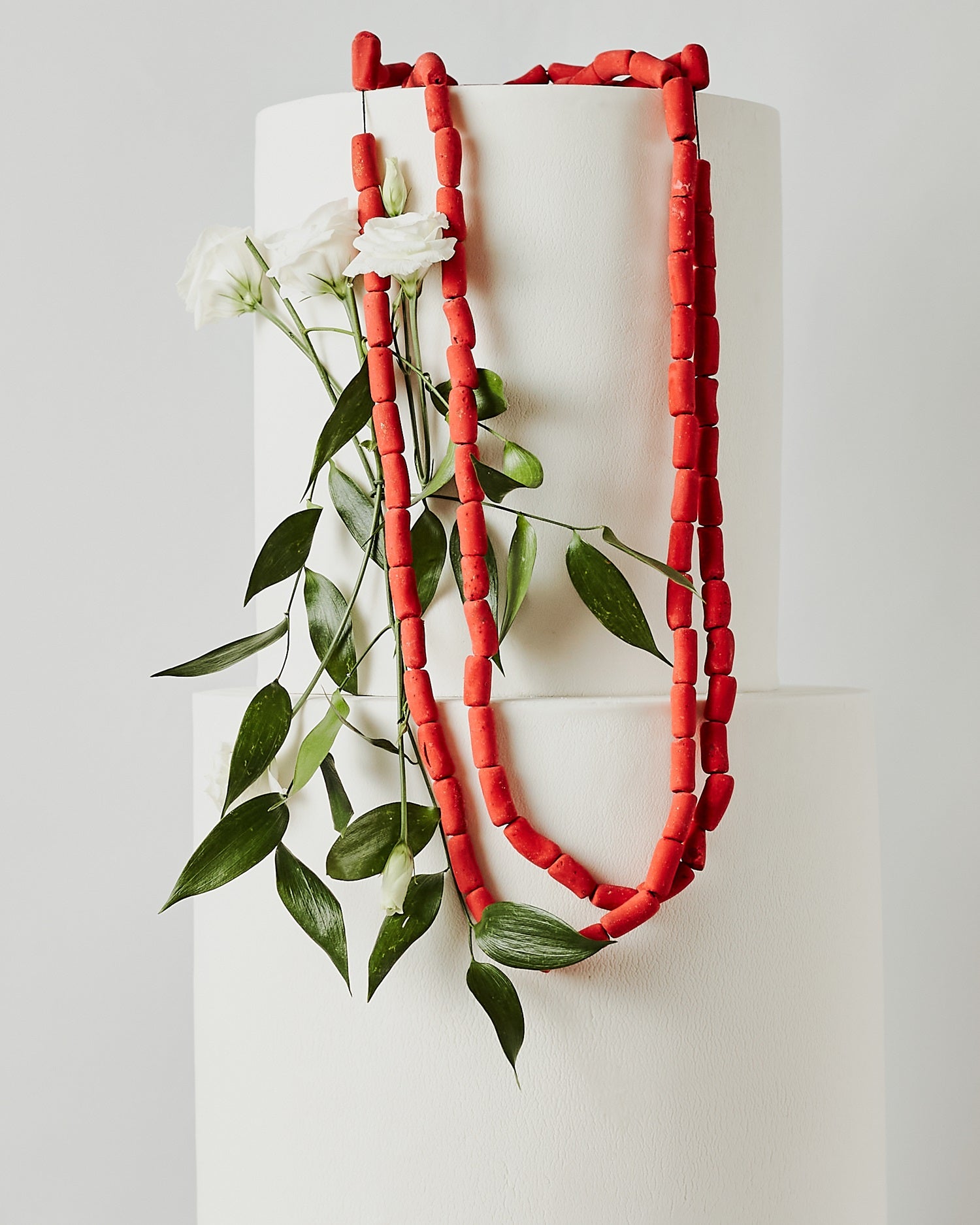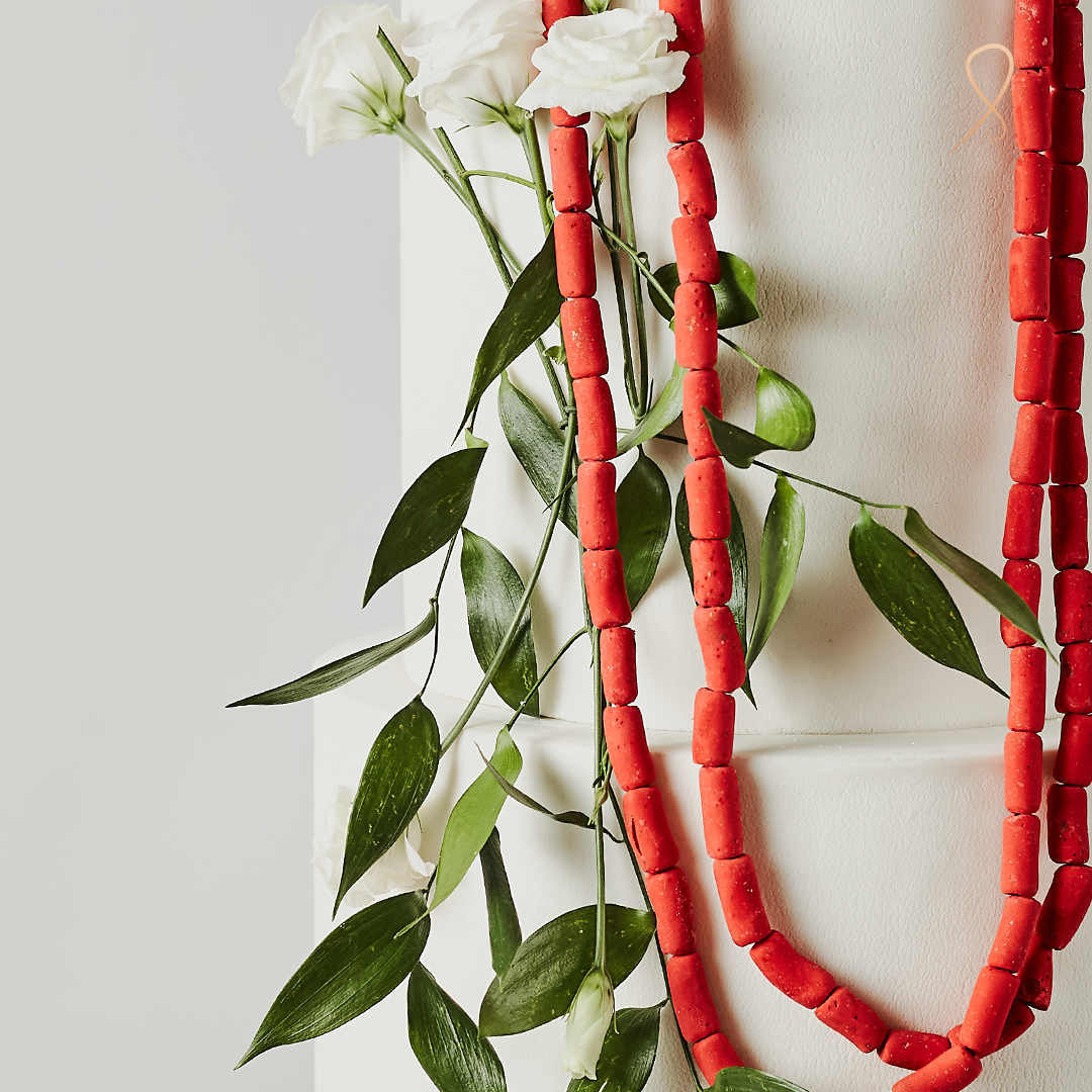 Royal Roots blends clean ivory fondant with the bold, symbolic beauty of traditional coral bead strands and soft white florals. This tall, double-tiered design honors heritage with elegance, making it ideal for weddings, introductions, and cultural milestones. Add a name, topper, or floral color to make it yours.