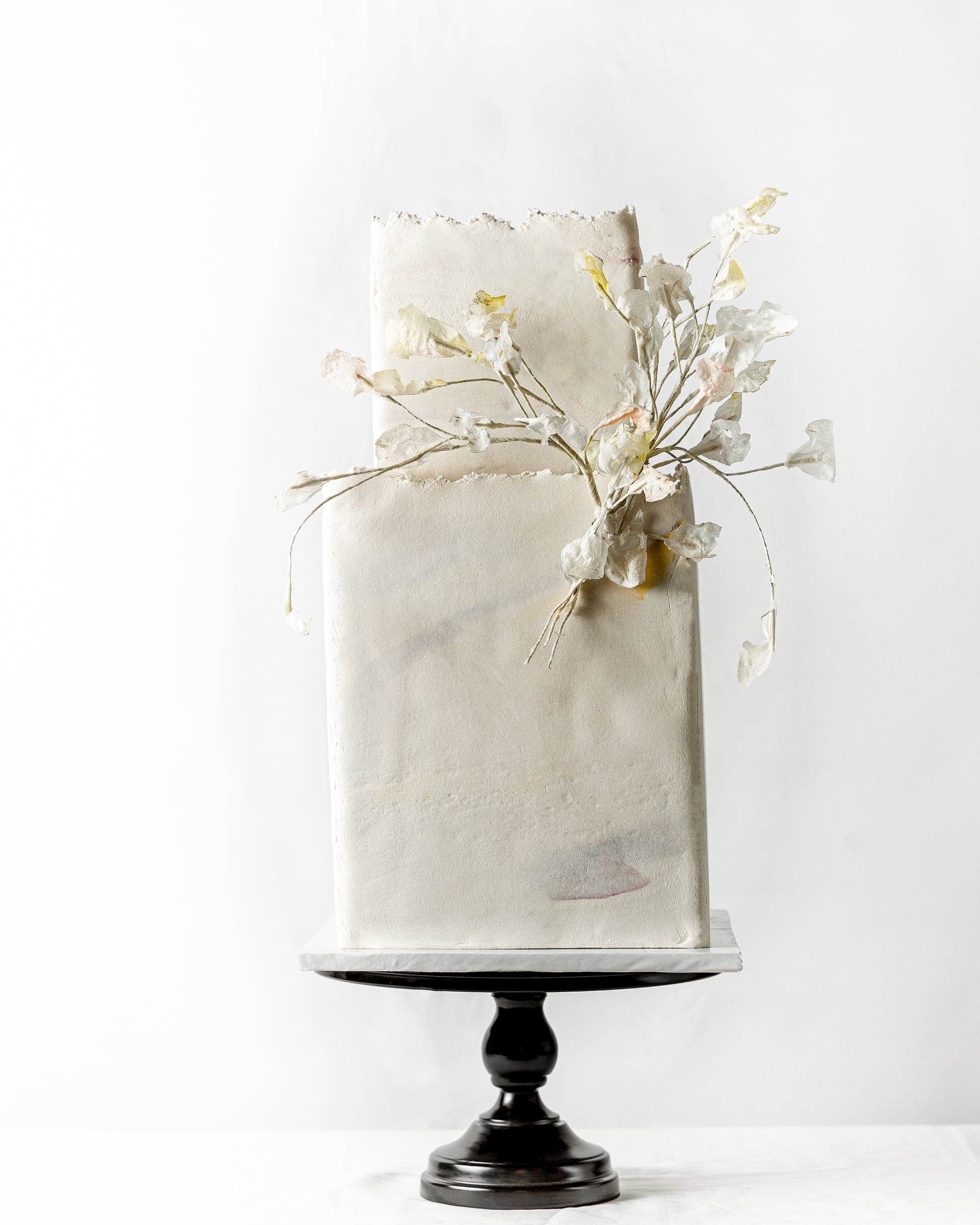 Silent Meadow evokes the stillness of a soft breeze through wildflowers. Featuring two tall, squared tiers in a hand-textured ivory finish, its imperfect torn edges add gentle poetry. Pale sugar leaves and petals in soft blush, yellow, and cream sweep naturally across the surface like dried florals in motion. Ideal for intimate weddings, artful showers, or modern minimalist events. Add custom sugar botanicals or soft metallic highlights
