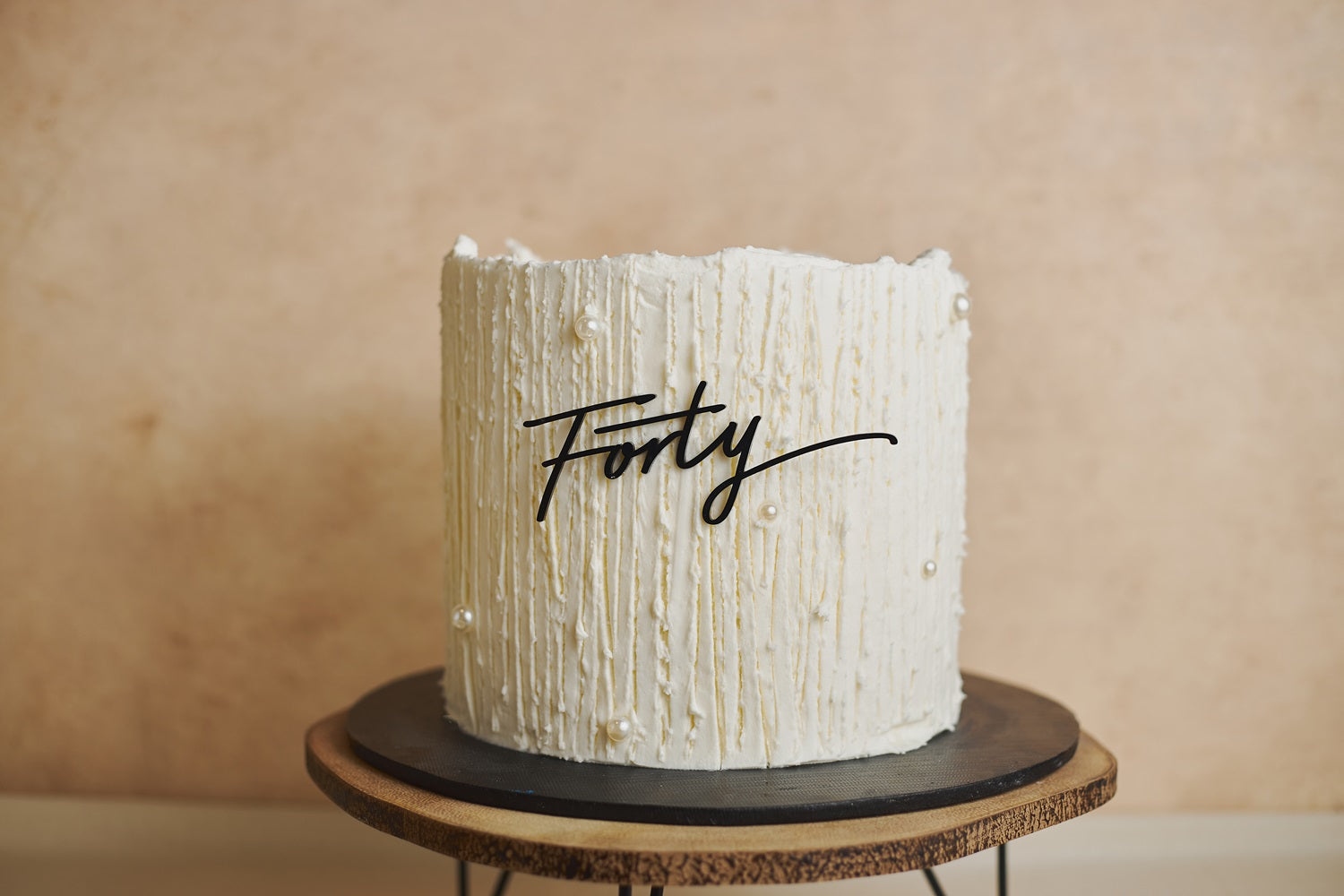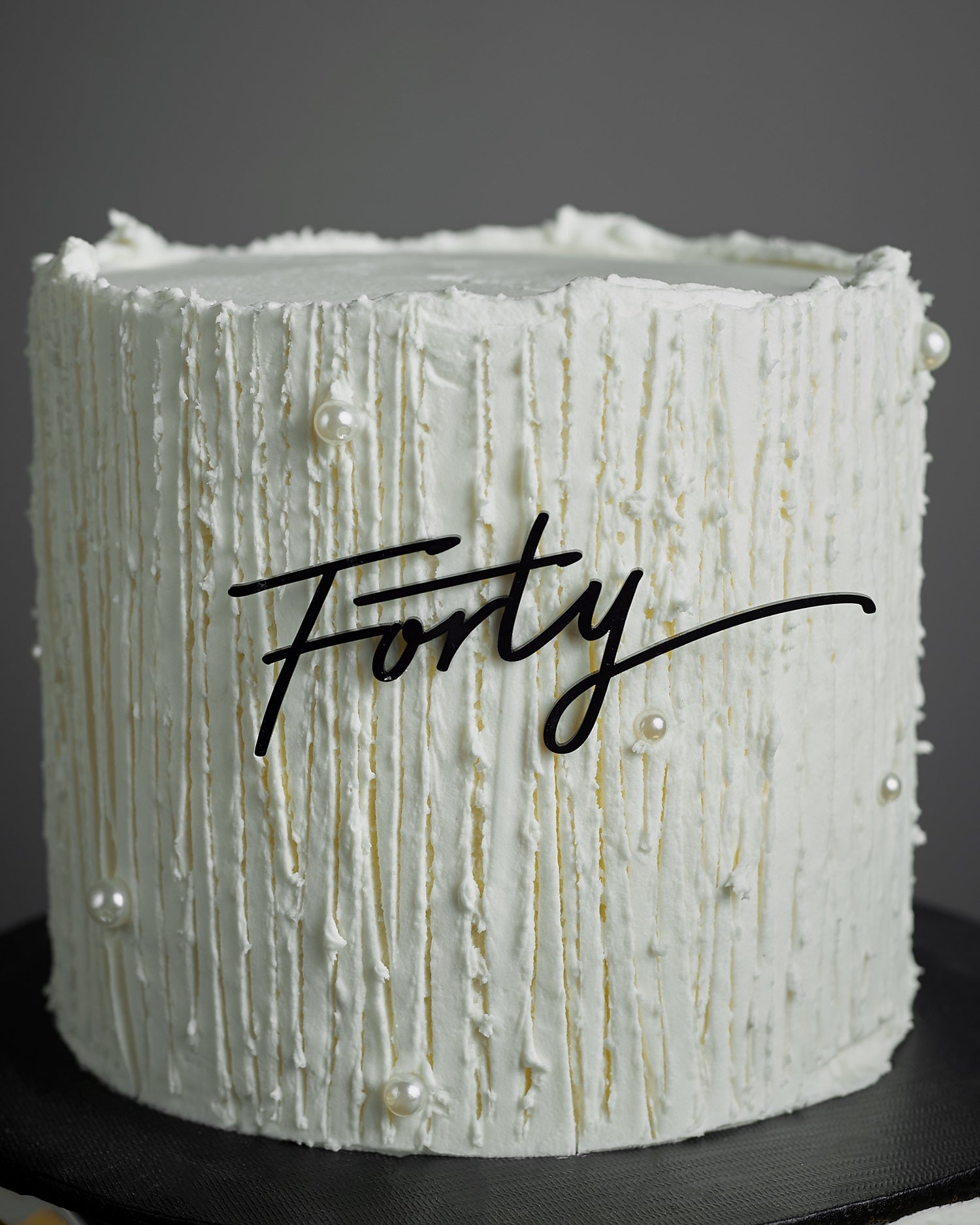 With tall, textured white buttercream and delicate edible pearls, Simply Forty is a minimalist dream designed to honor a milestone in style. The clean, vertical strokes and chic black “Forty” topper make it the perfect centerpiece. Personalize with names, alternate numbers, or accent colors for birthdays or glamorous adult celebrations.