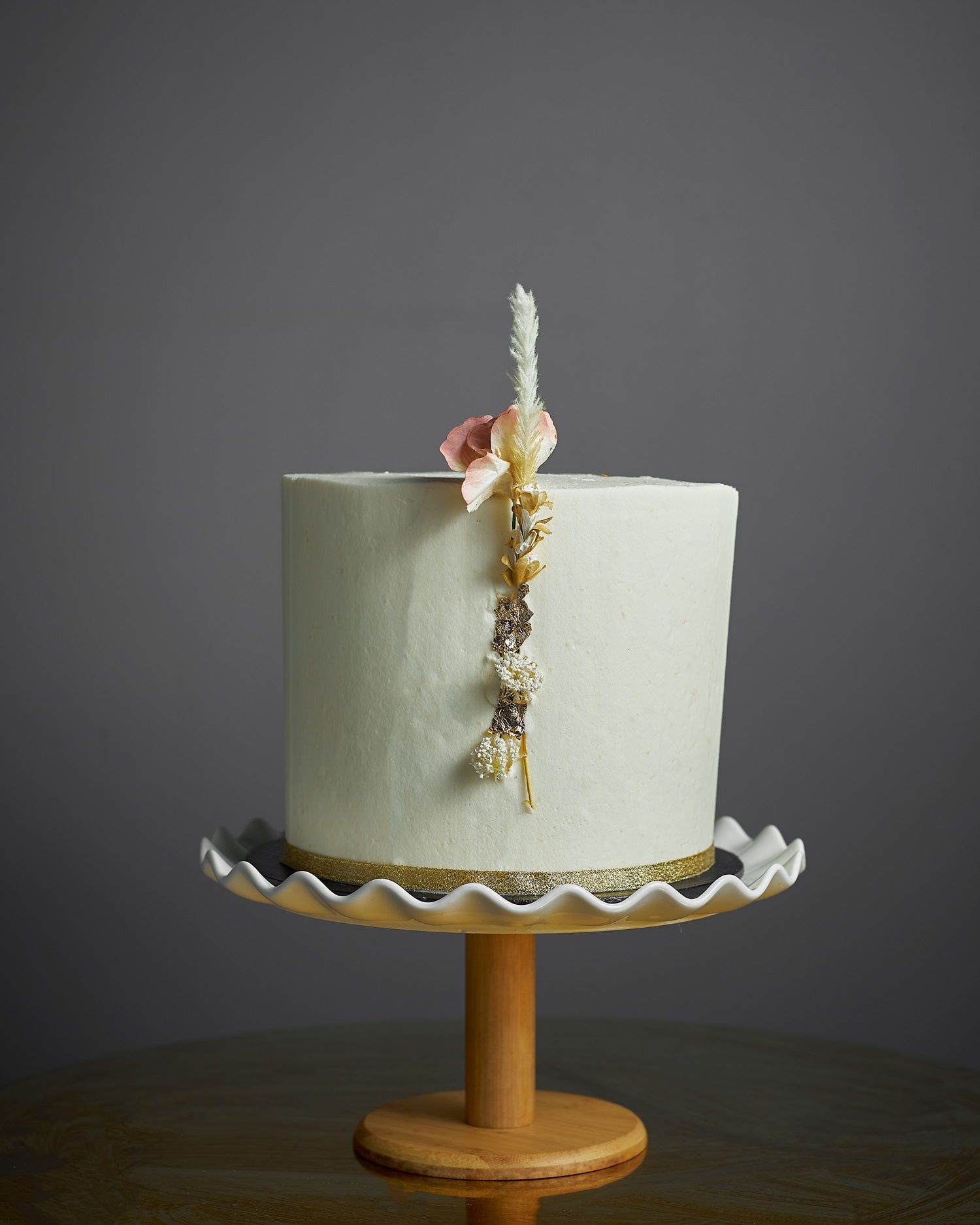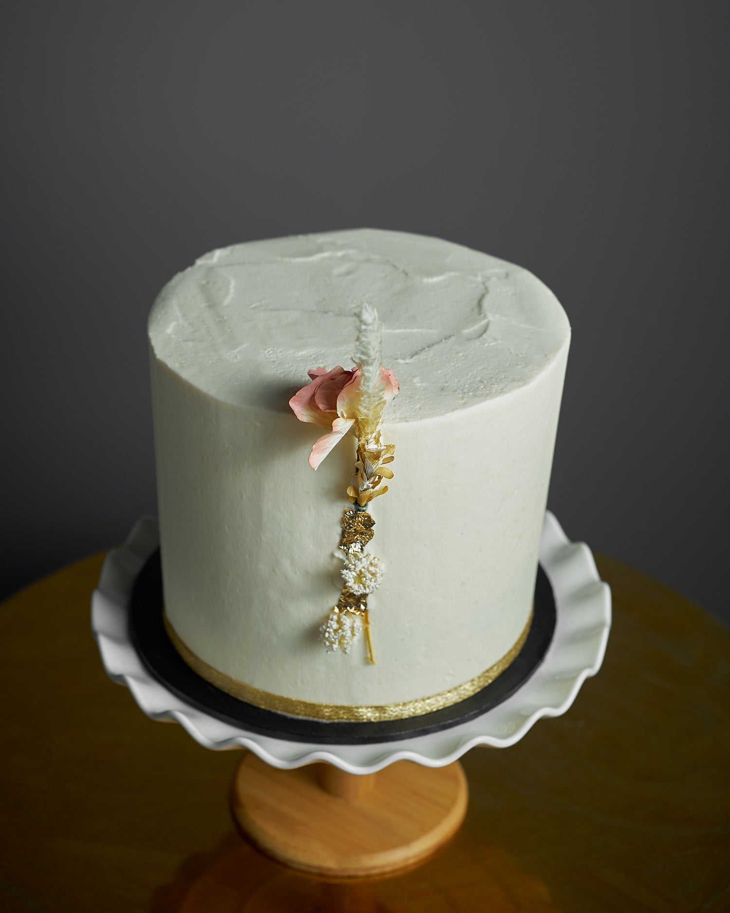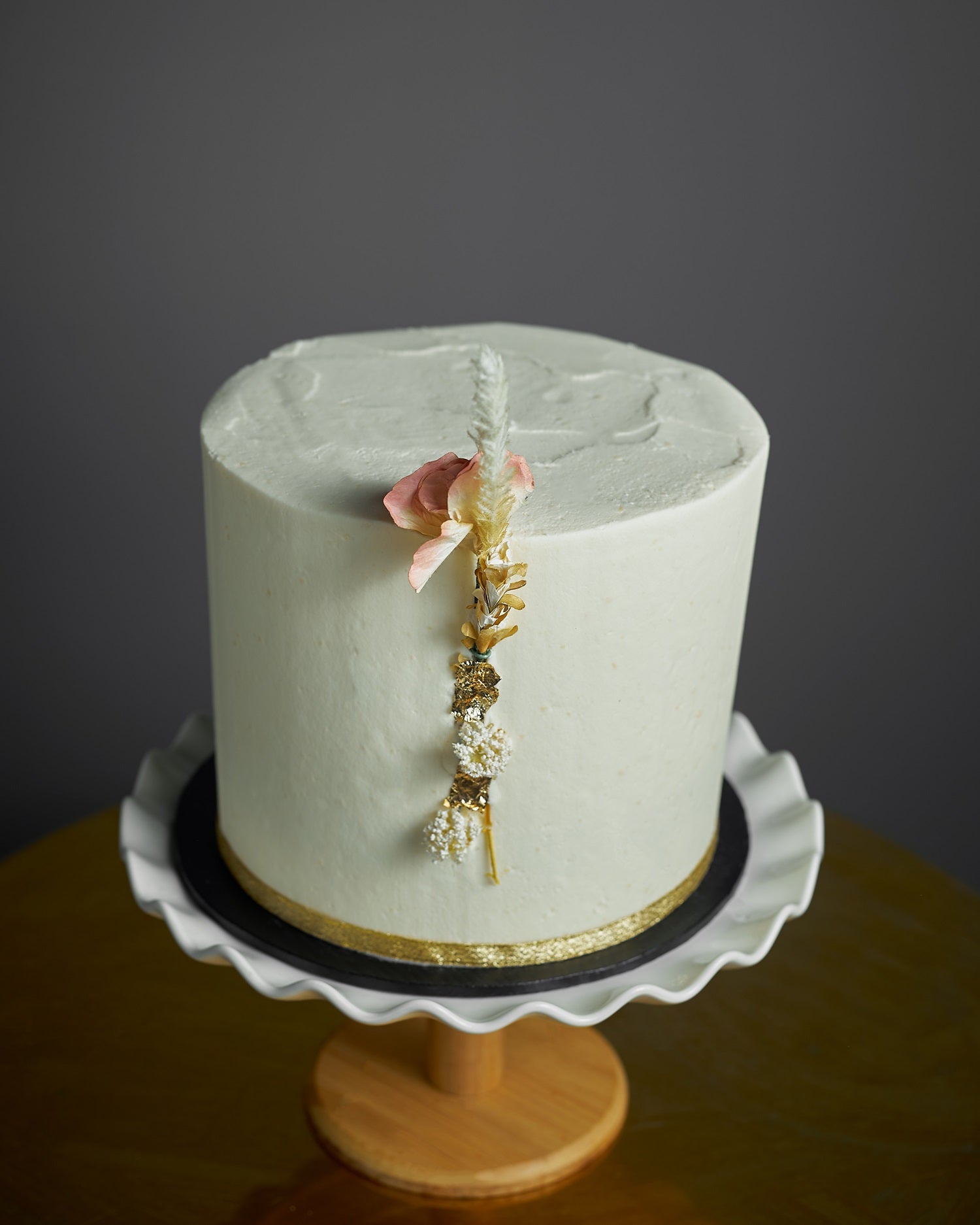Soft Spoken brings serene elegance with its pale sage buttercream, dried floral accent, and a subtle gold band. Understated yet deeply memorable, it’s the kind of cake that whispers sophistication. Ideal for weddings, baby showers, or intimate birthdays. Customize with color shifts, initials, or a petite topper for a personal touch.