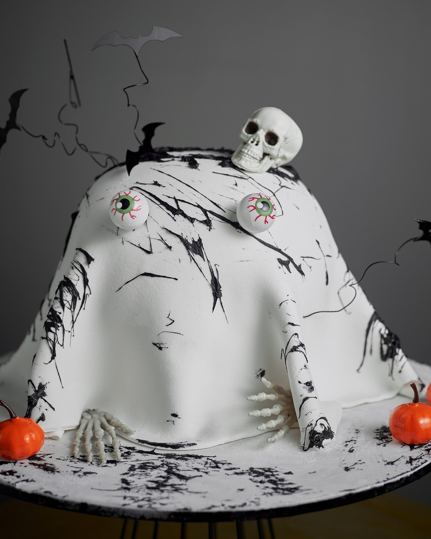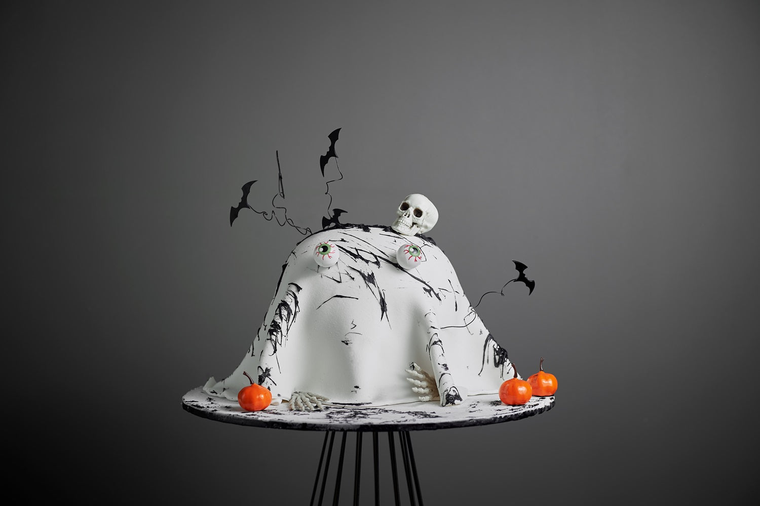 The Haunted Hideout is Halloween magic in cake form. Draped in eerie white fondant with skeleton limbs, creepy eyeballs, bats, and pumpkins, it brings fun fright to any celebration. Ideal for spooky birthdays or Halloween parties, this ghostly cake is as delicious as it is dramatic. Customize with names, colors, or extra frightful flair.