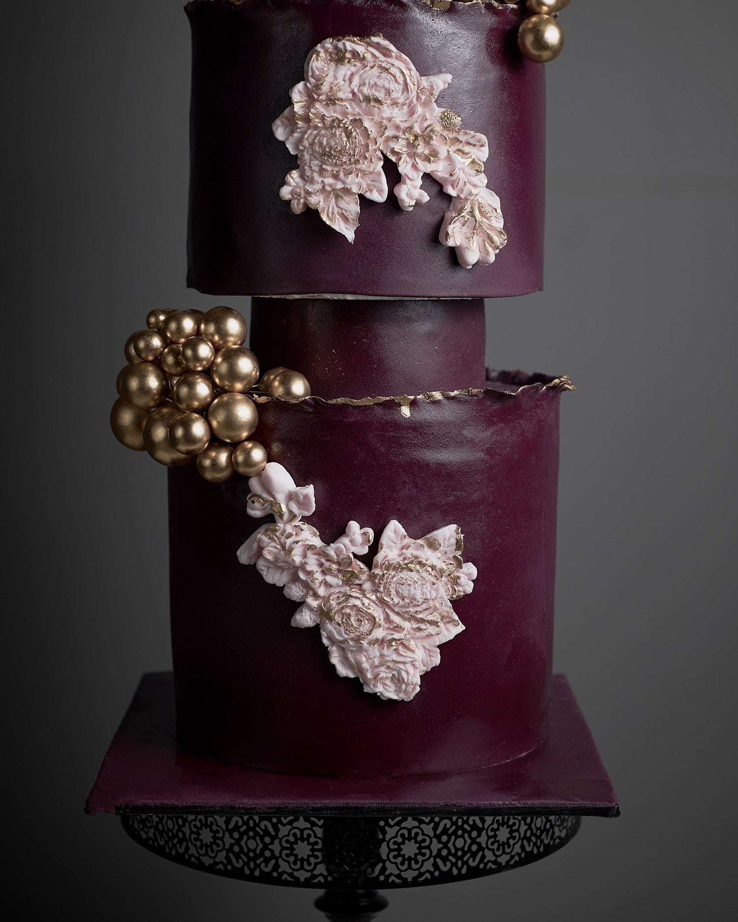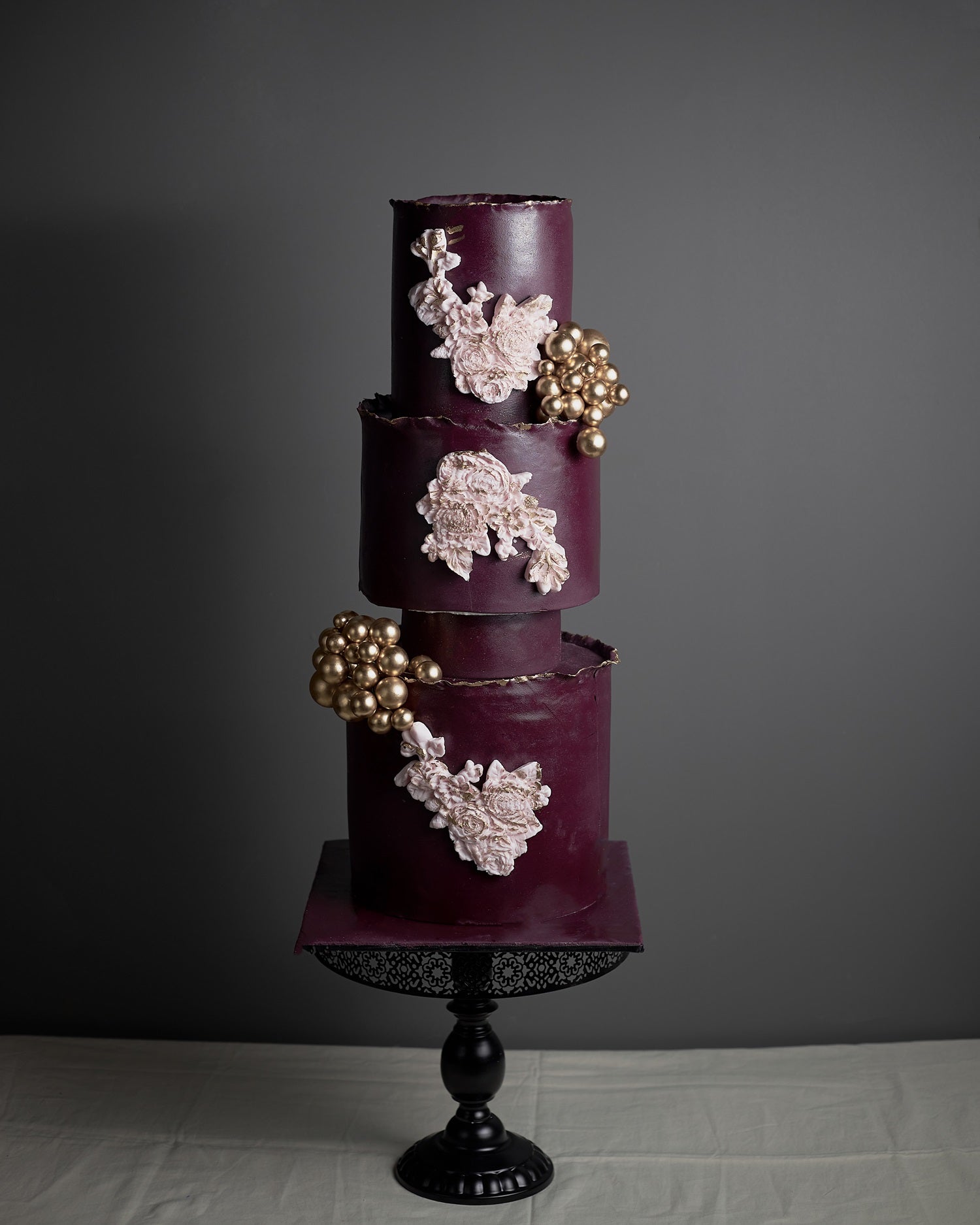 Velvet Bloom is a stunning three-tier cake dressed in rich plum tones with sculpted blush lace florals and clusters of metallic gold chocolate pearls. Its tall, modern silhouette makes it the perfect showstopper for weddings, milestone birthdays, and luxe events. Customize with color swaps, initials, or toppers to match your unique moment.