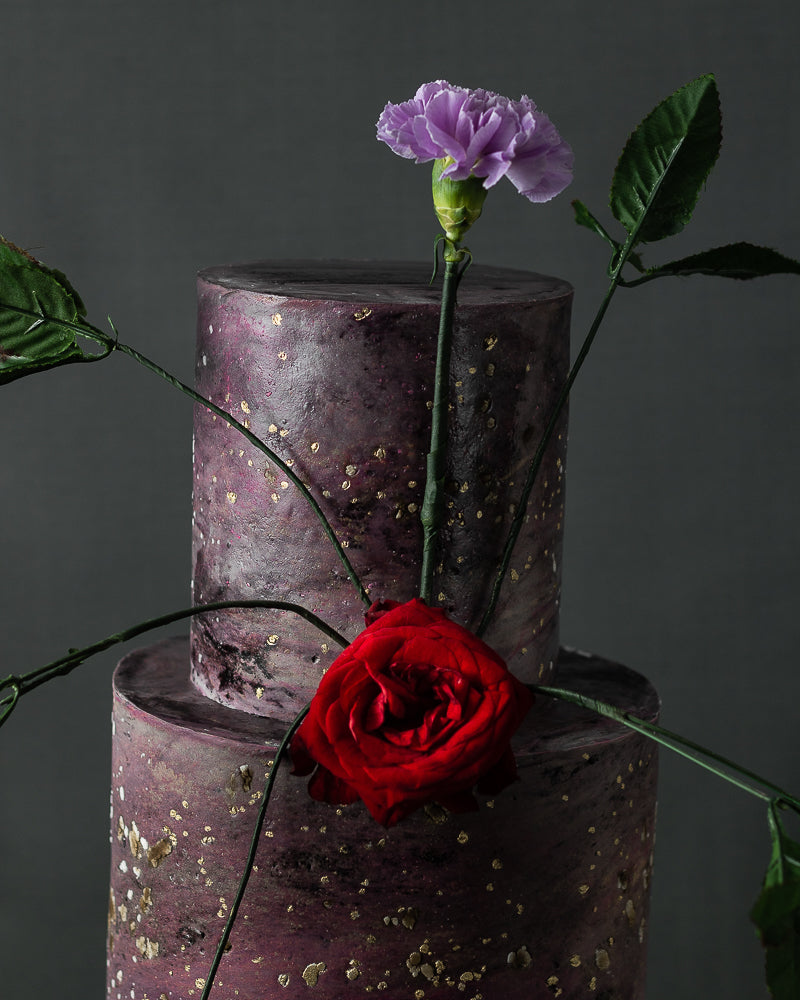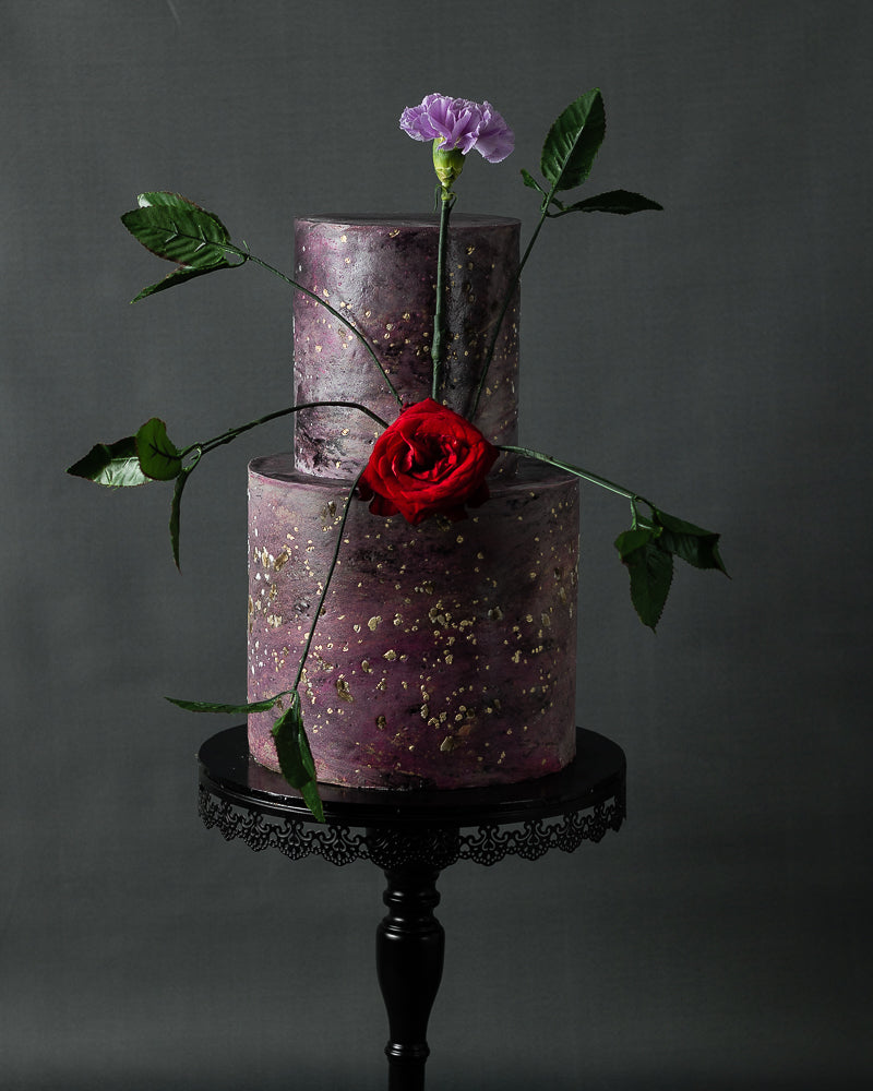 Velvet Thorn is bold romance in cake form. Marbled in rich plum and midnight hues, its matte finish glimmers with scattered gold leaf. A single crimson rose pierces the design, adding depth and emotional drama. Made for moody weddings, engagement parties, or modern elopements