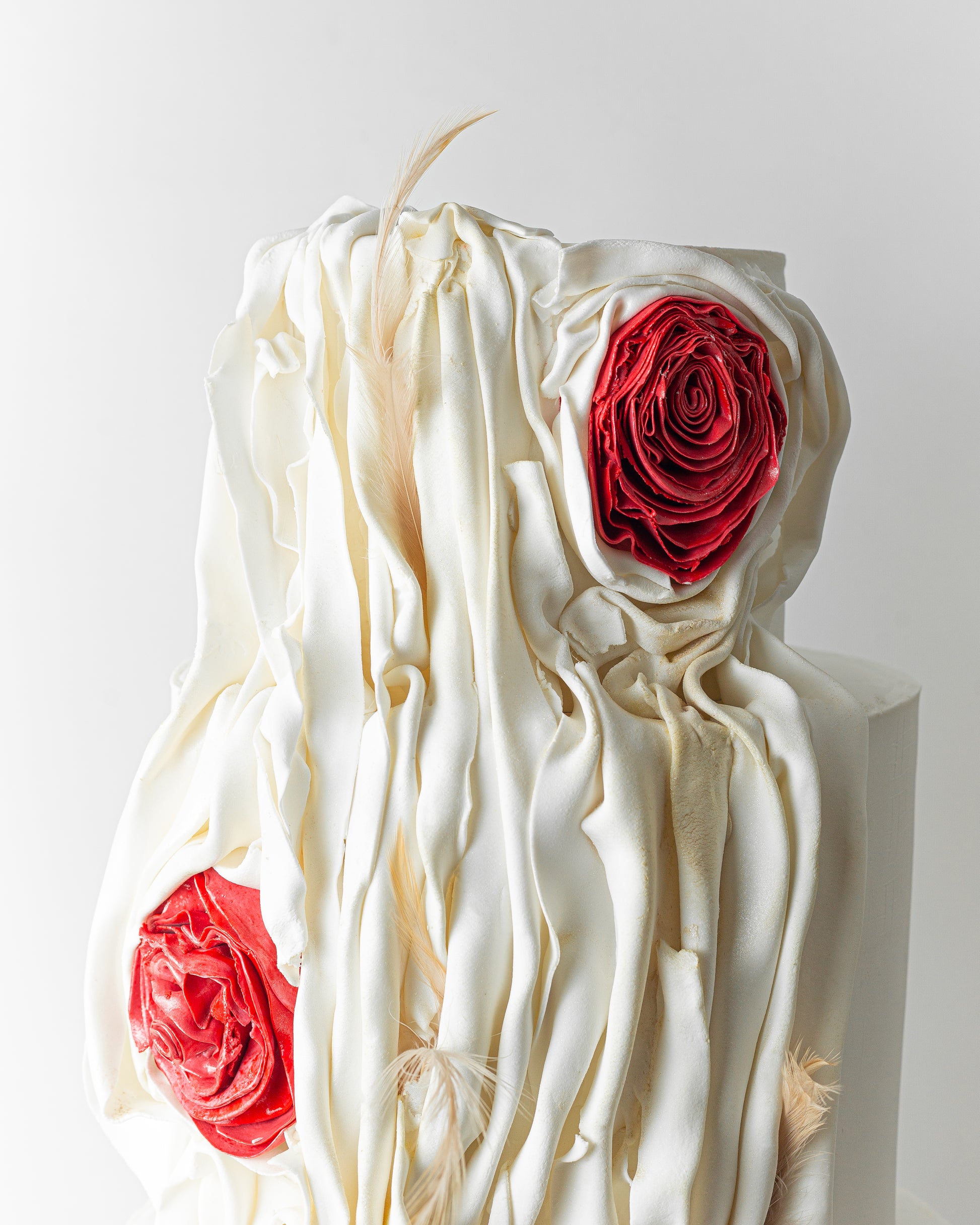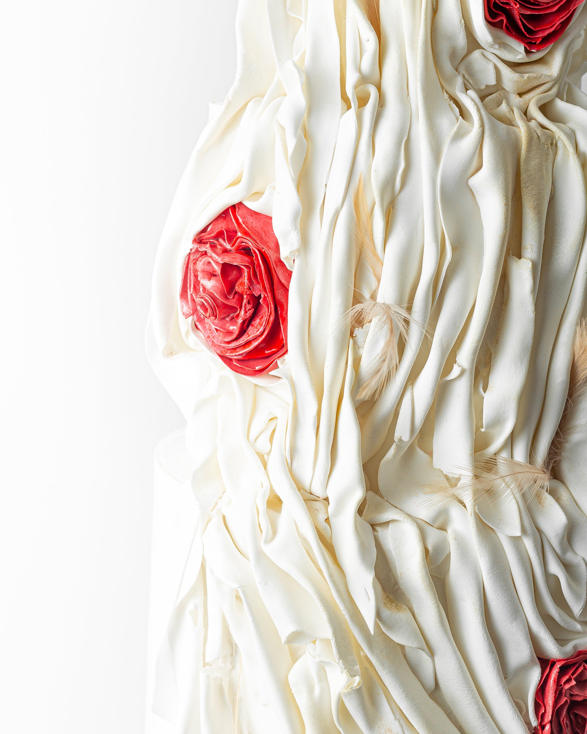 vintage roses and ruffles showcases delicately ruffled ivory fondant cascading like fabric, accented by rich red rosettes that add passion and depth. The textured draping invites a tactile, emotional experience, perfect for weddings, anniversaries, or refined parties. Personalize with custom colors, toppers, or messages to suit your story.